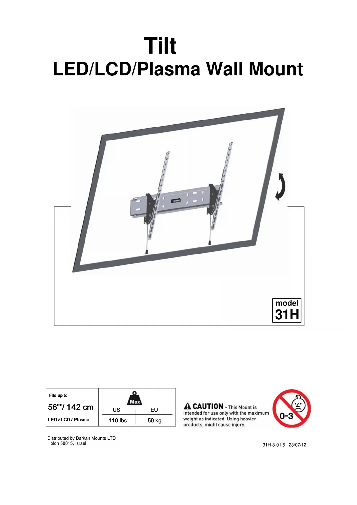des supports LCD/Plasma) doivent être huilés une fois par an ou quand l’articulation devient difficile. A. Supports pour TV et magnétoscope - Pour ajuster l’appareil électrique, exercez une poussée ou une traction uniquement sur le support et non sur l'appareil électrique! B. Les supports pour écrans LCD/Plasma peuvent être tournés et inclinés en exerçant une pression sur l’écran lentement et avec précaution. Barkan Mounts Ltd ne garantie pas l'installation. Veuillez vous adresser à votre installateur agrée afin de recevoir un certificat de garantie. Garantie DU PRODUIT - ans de garantie du produit apparaît sur l'emballage du produit ainsi que dans le site www.barkanmounts. com Cher client – Nous vous remercions d’avoir acquis un des produits de haute qualité Barkan. Nous vous souhaitons de nombreuses heures de vision et d’écoute de vos programmes préférés. Barkan Mounts ltd garantit le remplacement ou la réparation de cet article, gratuitement, s’il est constaté un défaut dans les matériaux ou la fabrication. Si vous effectuez une réclamation en vertu de cette garantie, le support doit être retourné, frais d’envoi payés, accompagné des documents d’achat originaux à votre revendeur ou au distributeur Barkan. Cette garantie ne s’applique pas dans les cas suivants: 1. Les instructions d'assemblage n'ont pas été respectées. 2. Erosion de la peinture. 3. Dommages causés par les frottements. 4. L’installation d’autres appareils, non fabriqués par Barkan, sur le support /étagère. 5. Des modifications ou réparations non effectuées par Barkan. 6. Dommages causés par accident ou force majeure. 7. L’usage non conforme ou abusif. 8. Une mauvaise installation de l’appareil électrique sur le support. 9. Bris des caches en plastique.5 4