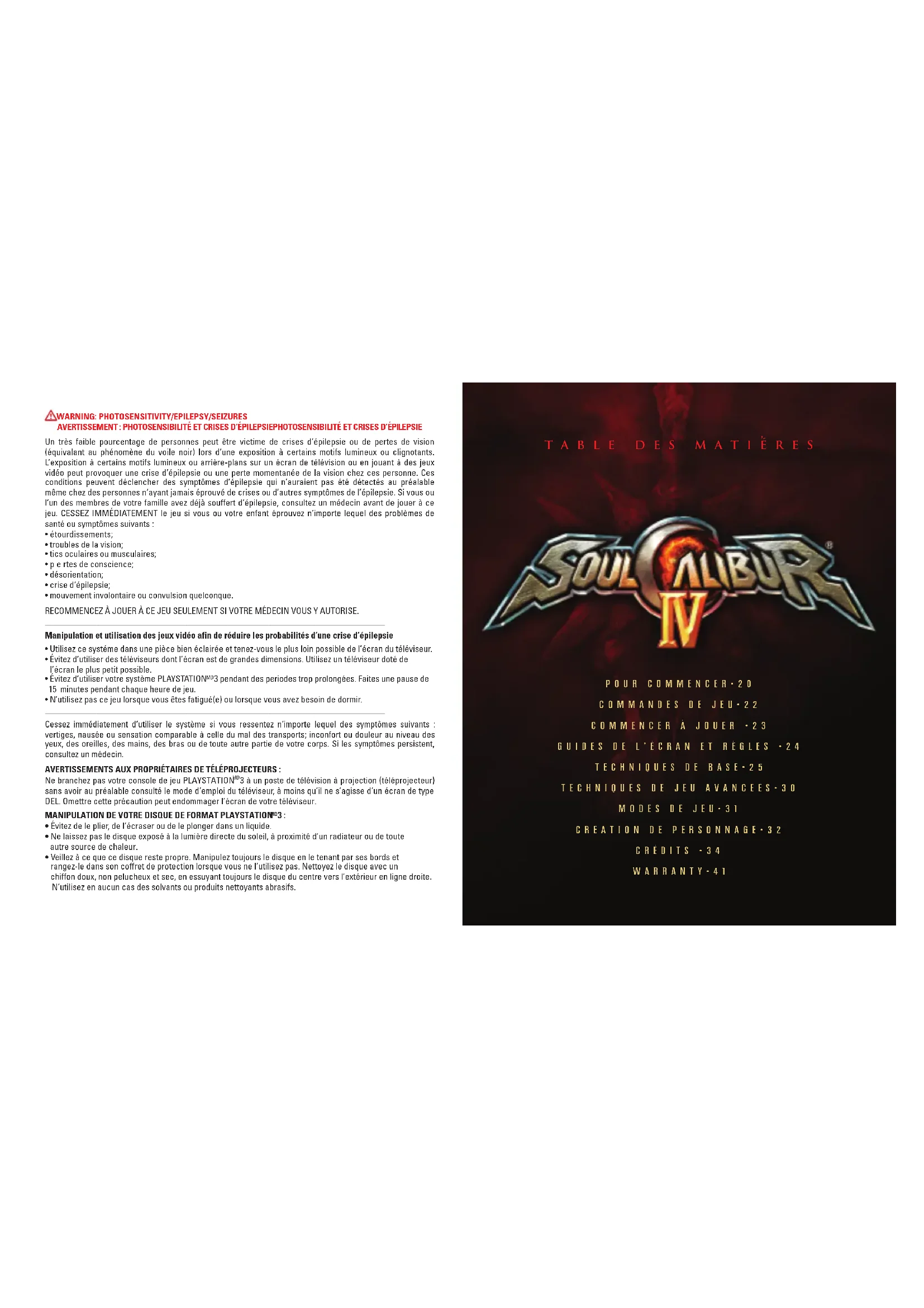 TABLE DES MATIÈRES SOUL ALBUR IV® POUR COMMENCER·20 COMMANDES DE JEU·22 COMMENCER À JOUER·23 GUIDES DE L'ÉCRAN ET RÈGLES·24 TECHNIQUES DE BASE·25 TECHNIQUES DE JEU AVANCEES·30 MODES DE JEU·31 CREATION DE PERSONNAGE·32 CRÉDITS·34 WARRANTY·41Système PLAYSTATION ^MD 3 vu de face