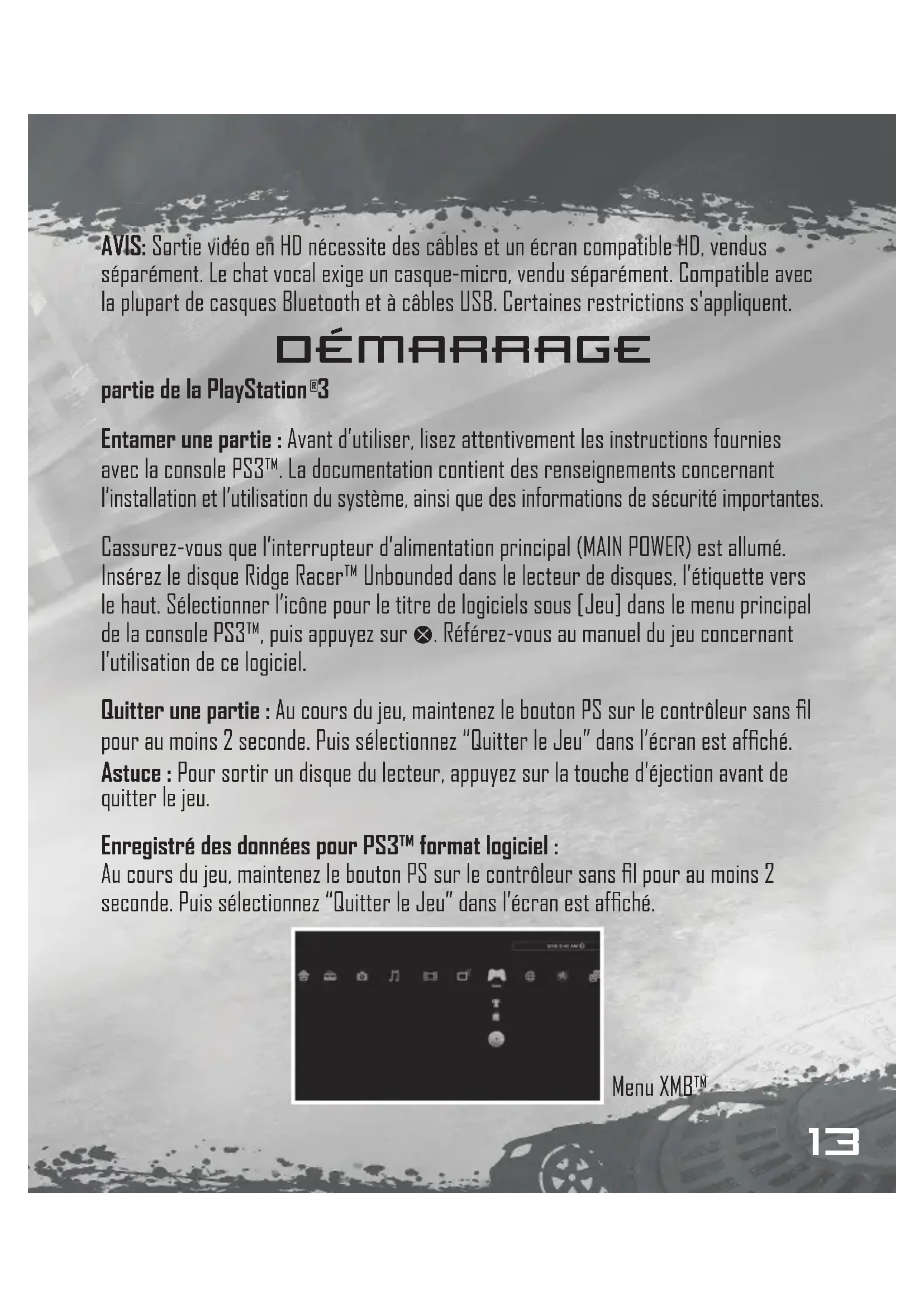 Entamer une partie : Avant d'utiliser, lisez attentivement les instructions fournies avec la console PS3™. La documentation contient des renseignements concernant l'installation et l'utilisation du système, ainsi que des informations de sécurité importantes.