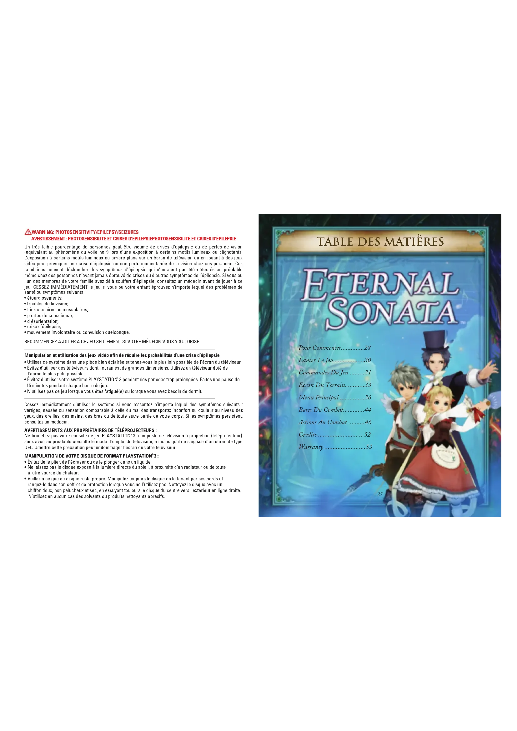 Un très faible pourcentage de personnes peut être victime de crises d'épilepsie ou de pertes de vision (équivalent au phénomène du voile noir) lors d'une exposition à certains motifs lumineux ou clignotants. L'exposition à certains motifs lumineux ou arrête-plans sur un écran de télévision ou en jouant à des yeux videoo peut provoquer une crise d'épilepsie ou une perte momentanée de la vision chez ces personne. Ces conditions peuvent déclencher des symptèmes d'épilepsie qui n'aurait pas été détectés au préalable même chez des personnes n' ayant jamais exprouve de crises ou d'autres symptèmes de l'épilepsy. Si vous ou l'un des membres de cette famille ayez déjà souffert d'épilepsie, consultez un medecin avant de jouer à ce jeu. CESSEZ IMMEDIATEMENT le jeu si vous ou votre enfant exprouvez n'imprime lequel des problèmes de santé ou symptèmes suivants: