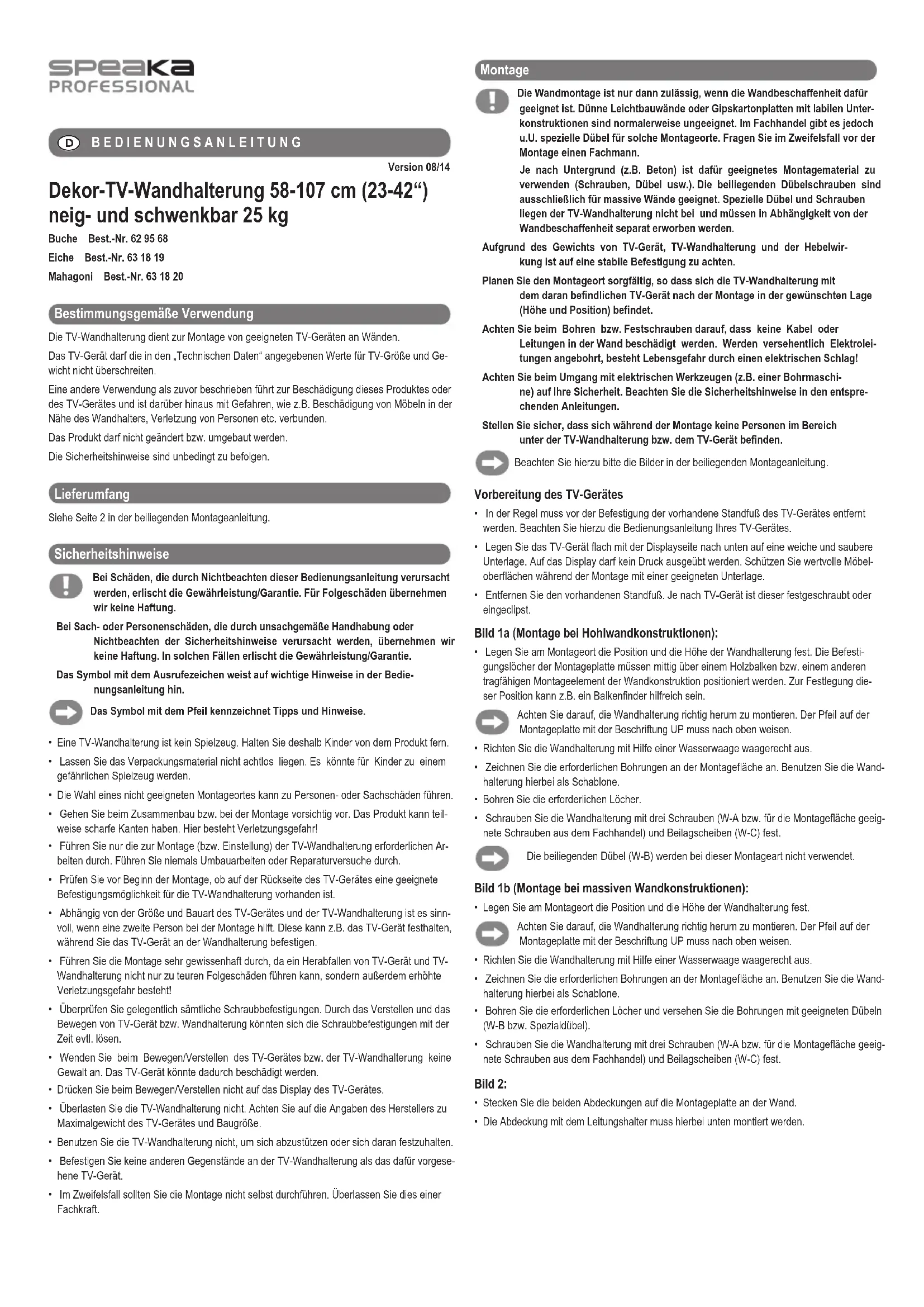 - Effectuez le montage très consciencieusement car la chute du téléviseur et du support mural pour téléviseur conduit non seulement à des dommages matériels couteux mais aussi à un risque élevé de dommages corporels!