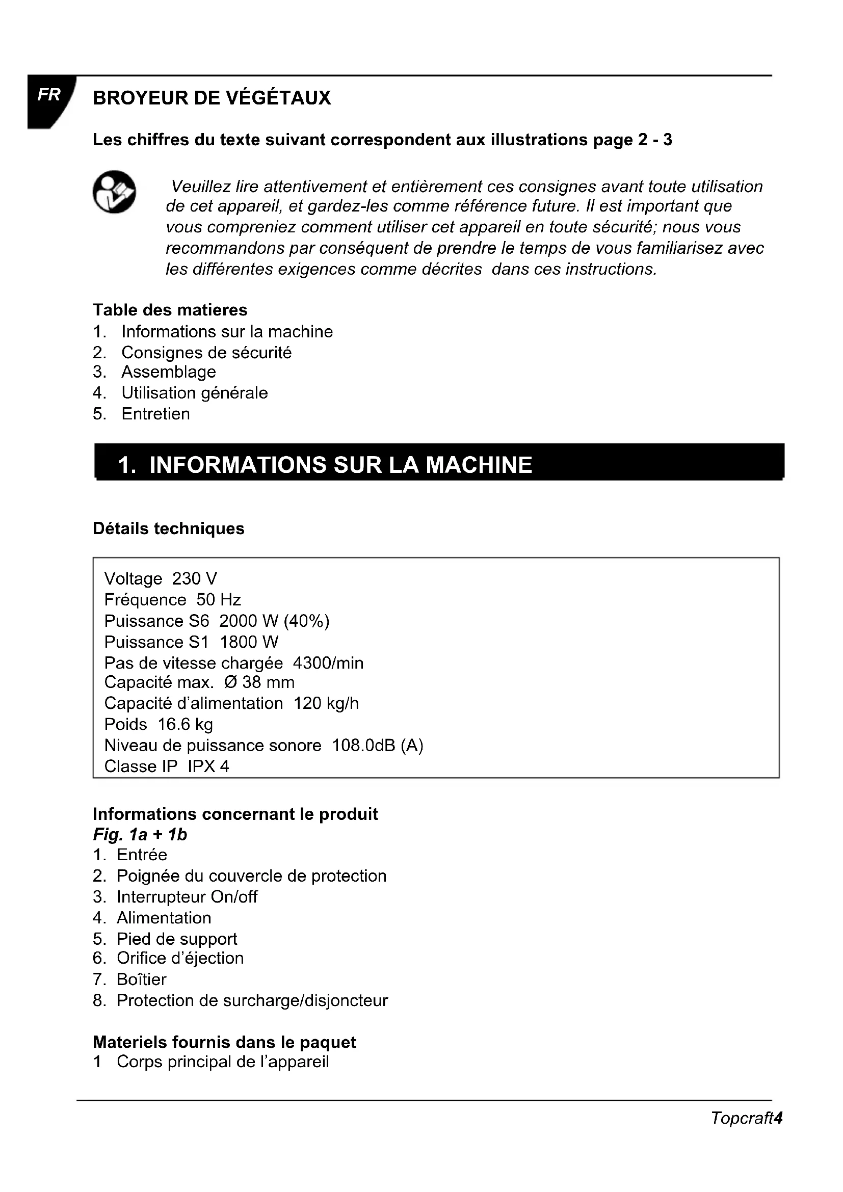 Détails techniques Voltage 230 V Fréquence 50 Hz Puissance S6 2000 W (40%) Puissance S1 1800 W Pas de vitesse chargée 4300/min Capacité max. Ø 38 mm Capacité d’alimentation 120 kg/h Poids 16.6 kg Niveau de puissance sonore 108.0dB (A) Classe IP IPX 4 Informations concernant le produit Fig. 1a + 1b