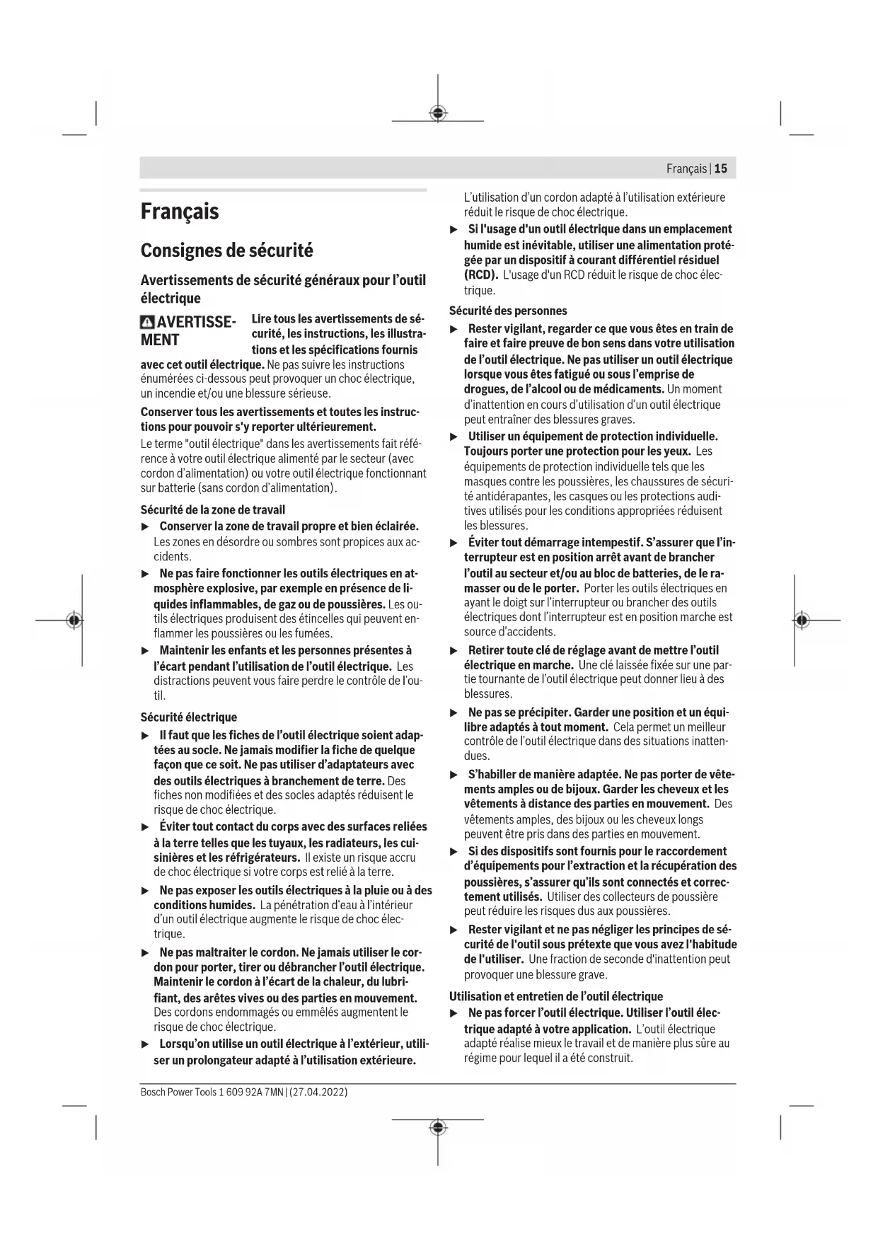 Le niveau de vibration et la valeur d’émission sonore indi- qués dans cette notice d’utilisation ont été mesurés selon une procédure de mesure normalisée et peuvent être utilisés pour établir une comparaison entre différents outils électro- portatifs. Ils peuvent aussi servir de base à une estimation préliminaire du taux de vibration et du niveau sonore. Bosch Power Tools 1 609 92A 7MN | (27.04.2022)18 | Français Le niveau de vibration et la valeur d’émission sonore indi- qués s’appliquent pour les utilisations principales de l’outil électroportatif. Si l’outil électroportatif est utilisé pour d’autres applications, avec d’autres accessoires de travail ou sans avoir fait l’objet d’un entretien régulier, le niveau de vi- bration et la valeur d’émission sonore peuvent différer. Il peut en résulter des vibrations et un niveau sonore nette- ment plus élevés pendant toute la durée de travail. Pour une estimation précise du niveau de vibration et du ni- veau sonore, il faut aussi prendre en considération les pé- riodes pendant lesquelles l’outil est éteint ou bien en marche sans être vraiment en action. Il peut en résulter au final un ni- veau de vibration et un niveau sonore nettement plus faibles pendant toute la durée de travail. Prévoyez des mesures de protection supplémentaires per- mettant de protéger l’utilisateur de l’effet des vibrations, par exemple : maintenance de l’outil électroportatif et des acces- soires de travail, maintien des mains au chaud, organisation des procédures de travail. Montage Fixer la poignée supplémentaire (voirillustrationA) Desserrez la vis(4) de la poignée supplémentaire(3) jus- qu’à ce que cette dernière tienne dans le logement(5). Enfoncez la poignée supplémentaire(3) dans le logement (5). Resserrez la poignée supplémentaire dans le sens ho- raire. Utilisation Mise en marche u Tenez compte de la tension du réseau! La tension de la source de courant doit correspondre aux indica- tions se trouvant sur la plaque signalétique de l’outil électroportatif. Les outils électroportatifs marqués 230V peuvent également fonctionner sur 220V. Mise en marche/arrêt Pour mettre en marche l’outil électroportatif, poussez l’in- terrupteur Marche/Arrêt(1) vers l’avant dans la position I. Pour arrêter l’outil électroportatif, poussez l’interrupteur Marche/Arrêt(1) vers l’arrière dans la position 0. Instructions d’utilisation u Débranchez le câble d’alimentation de la prise avant d’effectuer des travaux quels qu’il soient sur l’outil électroportatif. u Retirez l’accu de l’appareil électroportatif avant toute intervention (opérations d’entretien/de maintenance, changement d’accessoire, etc.) ainsi que lors de son transport et rangement. Il y a sinon risque de blessure lorsqu’on appuie par mégarde sur l’interrupteur Marche/ Arrêt. u Cet outil électroportatif n’est pas conçu pour une utili- sation stationnaire. Ne le serrez pas dans un étau et ne le fixez pas à un établi. u Portez des gants de protection pour travailler. Veillez à ce que les morceaux de tôle coupés ne s'incurvent pas en direction de votre corps. Les tôles découpées présentent des arêtes vives risquant de provoquer des blessures.Éloignez de votre corps les morceaux de tôle gênants avec des gants. u Portez des gants de protection pendant l'utilisation et veillez surtout à ne pas entailler le câble secteur. Veiller à ce que les morceaux de tôle coupés ne s'in- curvent pas en direction de votre corps ou du câble secteur. Les tôles coupées présentent des arêtes vives qui risquent de vous blesser ou d’endommager le câble secteur.Éloignez de votre corps ou du câble secteur les morceaux de tôle gênants avec des gants. N’approchez l’outil électroportatif de la pièce à travailler que quand l’appareil est en marche. Tenez l'outil électroportatif à un angle de 15° par rapport à la surface de la tôle et ne l'inclinez pas sur le côté. Guider l’outil électroportatif de façon régulière et en effec- tuant une avance modérée dans le sens de la coupe. Une avance trop forte réduit considérablement la durée de vie des outils électroportatifs et peut endommager l’outil élec- troportatif. Pour effectuer des coupes curvilignes, veillez spécialement à ne pas coincer l’outil électroportatif latéralement et ne tra- vaillez qu’en appliquant une faible avance. Épaisseur de tôle max. à couper L’épaisseur de tôle max. à couper d max dépend de la solidité du matériau à travailler. Avec l’outil électroportatif, il est possible de couper des tôles jusqu’à l’épaisseur suivante: Matériau Solidité max. (N/mm