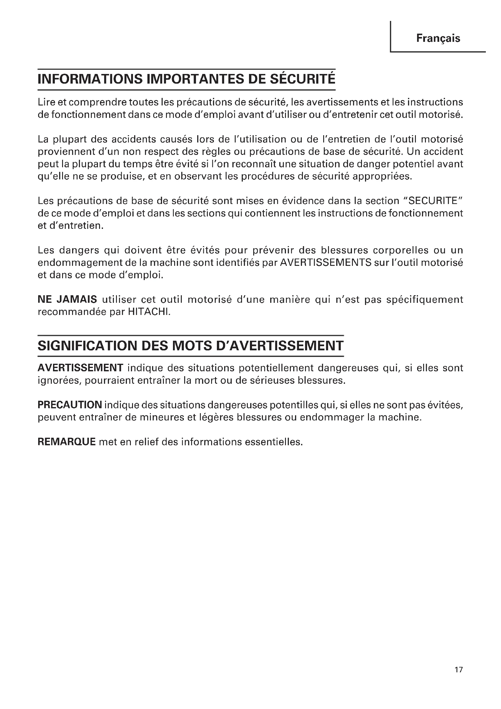 Lire et comprendre toutes les précautions de sécurité, les avertissements et les instructions de fonctionnement dans ce mode d’emploi avant d’utiliser ou d’entretenir cet outil motorisé. La plupart des accidents causés lors de l’utilisation ou de l’entretien de l’outil motorisé proviennent d’un non respect des règles ou précautions de base de sécurité. Un accident peut la plupart du temps être évité si l’on reconnaît une situation de danger potentiel avant qu’elle ne se produise, et en observant les procédures de sécurité appropriées. Les précautions de base de sécurité sont mises en évidence dans la section “SECURITE” de ce mode d’emploi et dans les sections qui contiennent les instructions de fonctionnement et d’entretien. Les dangers qui doivent être évités pour prévenir des blessures corporelles ou un endommagement de la machine sont identifiés par AVERTISSEMENTS sur l’outil motorisé et dans ce mode d’emploi. NE JAMAIS utiliser cet outil motorisé d’une manière qui n’est pas spécifiquement recommandée par HITACHI.