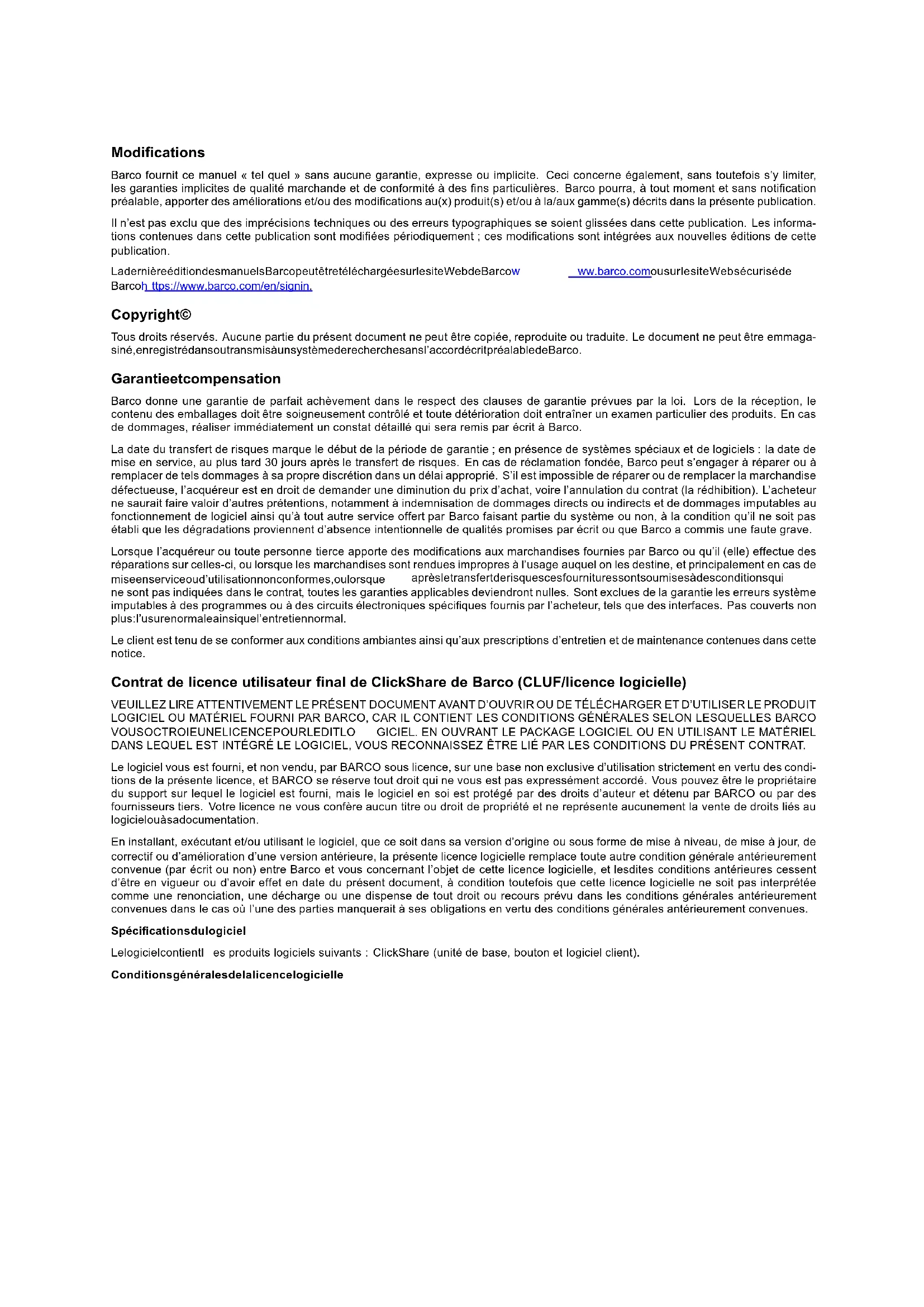 VEUILLEZ LIRE ATTENTIVEMENT LE PRÉSENT DOCUMENT AVANT D'OUVRIR OU DE TÉLÉCHARGER ET D'UTILISER LE PRODUIT LOGICIEL OU MATÉRIEL FOURNI PAR BARCO, CAR IL CONTIENT LES CONDITIONS GÉNÉRALES SELON LESQUELLES BARCO VOUSOCTROIEUNELICENCEPOURLEDITLO GICIEL. EN OUVRANT LE PACKAGE LOGICIEL OU EN UTILISANT LE MATÉRIEL DANS LEQUEL EST INTÉGRÉ LE LOGICIEL, VOUS RECONNAISSEZ ÊTRE LIÉ PAR LES CONDITIONS DU PRÉSENT CONTRAT.