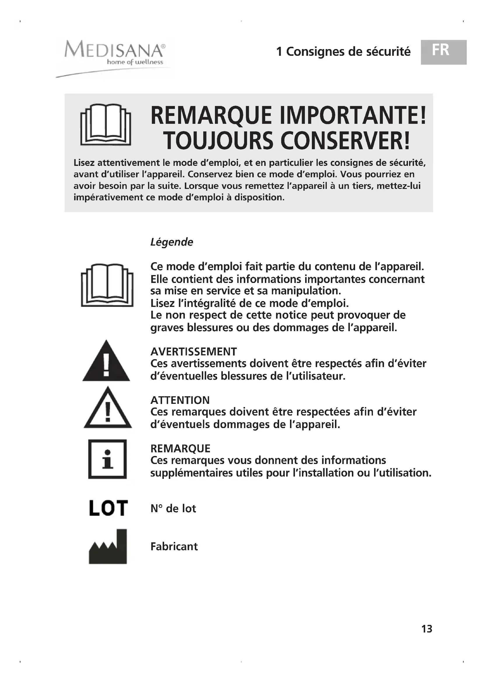 Ces avertissements doivent être respectés afin d'éviter d'éventuelles blessures de l'utilisateur.