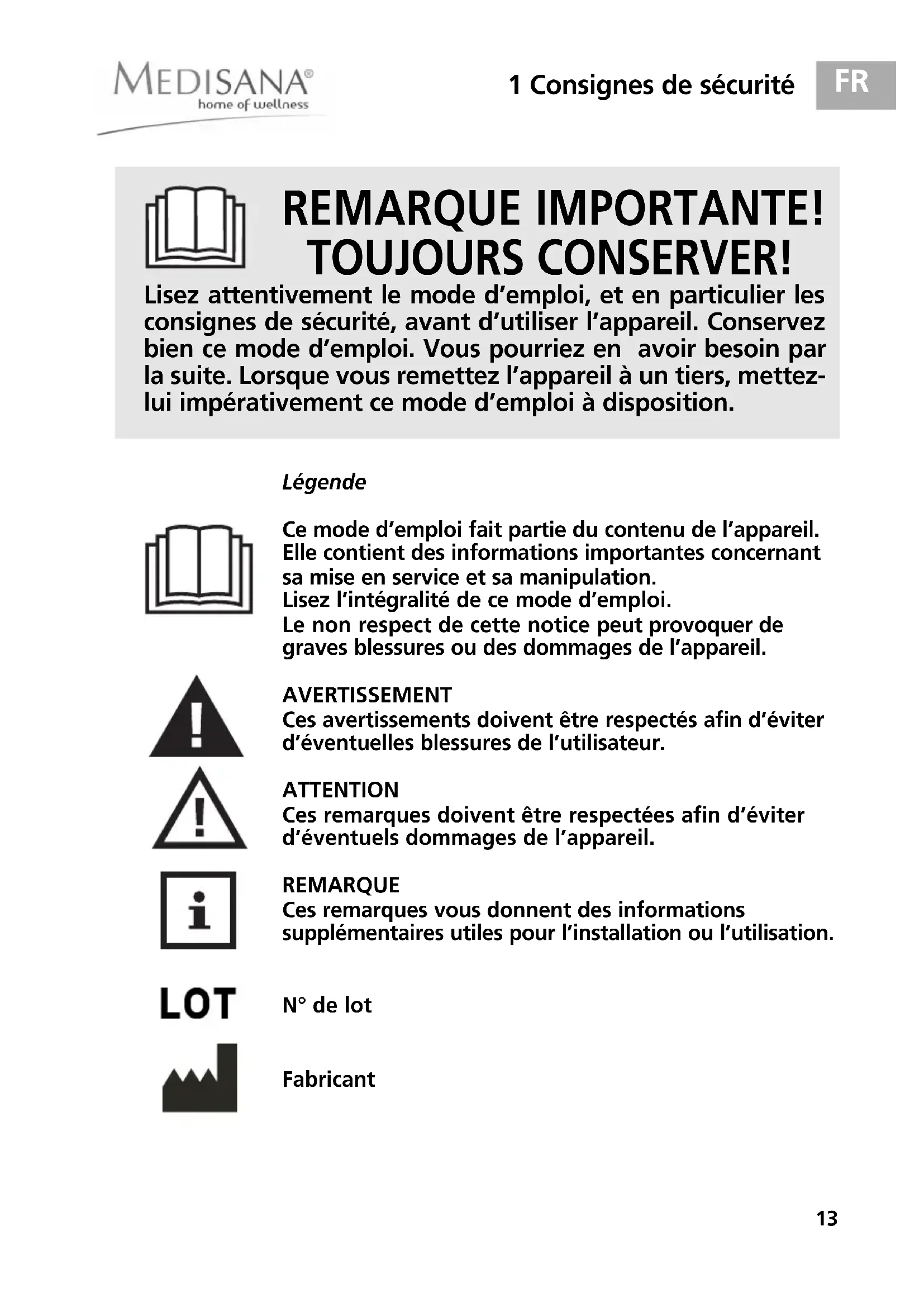 Ces avertissements doivent être respectés afin d'éviter d'éventuelles blessures de l'utilisateur.