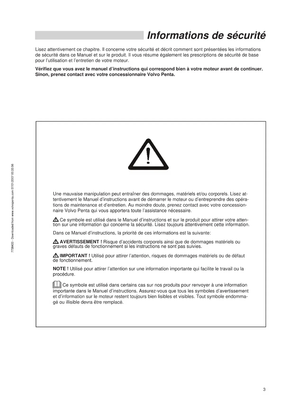 All rights to changes or modifications reserved. Printed on environmentally-friendly paper Sommaire 7738433 - Downloaded from www.volvopenta.com 07/01/2007 00:33:563 Informations de sécurité Lisez attentivement ce chapitre. Il concerne votre sécurité et décrit comment sont présentées les informations de sécurité dans ce Manuel et sur le produit. Il vous résume également les prescriptions de sécurité de base pour l’utilisation et l’entretien de votre moteur. Vérifiez que vous avez le manuel d’instructions qui correspond bien à votre moteur avant de continuer. Sinon, prenez contact avec votre concessionnaire Volvo Penta. Une mauvaise manipulation peut entraîner des dommages, matériels et/ou corporels. Lisez at- tentivement le Manuel d’instructions avant de démarrer le moteur ou d’entreprendre des opéra- tions de maintenance et d’entretien. Au moindre doute, prenez contact avec votre concession- naire Volvo Penta qui vous apportera toute l’assistance nécessaire. Ce symbole est utilisé dans le Manuel d’instructions et sur le produit pour attirer votre atten- tion sur une information qui concerne la sécurité. Lisez toujours attentivement cette information. Dans ce Manuel d’instructions, la priorité de ces informations est la suivante: AVERTISSEMENT ! Risque d’accidents corporels ainsi que de dommages matériels ou graves défauts de fonctionnement si les instructions ne sont pas suivies. IMPORTANT ! Utilisé pour attirer l’attention, risques de dommages matériels ou de défaut de fonctionnement. NOTE ! Utilisé pour attirer l’attention sur une information importante qui facilite le travail ou la procédure. Ce symbole est utilisé dans certains cas sur nos produits pour renvoyer à une information importante dans le Manuel d’instructions. Assurez-vous que tous les symboles d’avertissement et d’information sur le moteur restent toujours bien lisibles et visibles. Tout symbole endomma- gé ou illisible devra être remplacé. 7738433 - Downloaded from www.volvopenta.com 07/01/2007 00:33:564 Prescriptions de sécurité pour les voyages en bateau Votre nouveau bateau Lisez attentivement les manuels d’instructions et toute autre information qui accompagnent votre nou- veau bateau. Familiarisez-vous avec les manoeu- vres, les commandes et les autres équipements en toute sécurité. S’il s’agit de votre premier bateau ou d’un type de bateau que vous ne connaissez pas, nous vous re- commandons d’apprendre à manoeuvrer dans un endroit tranquille et calme. Apprenez à connaître les réactions de votre bateau dans différentes situations, vitesses, charges, conditions atmosphériques, avant de partir pour votre premier grand voyage. N’oubliez pas que, selon la loi, le propriétaire du ba- teau doit connaître et suivre les règles de circulation et de sécurité en mer. Informez vous au sujet des rè- gles en vigueur pour vous et dans les eaux où vous circulez en prenant contact avec les autorités com- pétentes ou l’organisation de la sécurité en mer. Un bon conseil consiste à suivre un cours de naviga- tion. Nous vous recommandons de prendre contact avec une organisation maritime régionale ou de sé- curité en mer pour une formation adéquate. Accidents et incidents D’après les statistiques de sauvetage en mer, un en- tretien insuffisant du bateau et du moteur ainsi qu’un équipement de sécurité obsolète ou absent sont sou- vent à l’origine des accidents et des incidents en mer. Veillez à ce que votre bateau et votre moteur reçoi- vent l’entretien correspondant aux indications don- nées dans le manuel d’instruction concerné et que l’équipement de sécurité nécessaire fonctionne et est en place sur le bateau. Contrôles quotidiens Prenez l’habitude de vérifier visuellement le compar- timent moteur et le moteur avant la conduite (avant de démarrer le moteur) et après la conduite (lors- que le moteur est arrêté). Cette précaution vous aide à localiser rapidement une éventuelle fuite de carburant, de liquide de refroidissement, d’huile ou toute autre anomalie présente ou en cours. Manoeuvres Evitez des manoeuvres et des changements de marche brusques et inattendus. Les personnes à bord risquent de tomber ou d’être projetées par dessus bord. Une hélice en rotation peut entraîner de graves dé- gâts. Vérifier que personne ne se trouve dans l’eau avant d’enclencher la marche avant/arrière. N’appro- chez jamais des baigneurs ou à proximité des en- droits où des gens peuvent se trouver dans l’eau. Evitez un réglage extrême de l’embase, la direction peut être gravement faussée. Remplissage de carburant N’oubliez pas les risques d’incendie et d’explosion en faisant le plein. Ne fumez pas à proximité et ne laissez pas tourner le moteur. Ne laissez jamais déborder le réservoir. Fermez bien le bouchon de réservoir. Utilisez uniquement le carburant recommandé dans le manuel d’instructions. Du carburant de qualité inexacte peut entraîner des perturbations de fonc- tionnement ou des arrêts imprévus. Sur un moteur diesel, la tige de commande peut même gripper d’où risque de sur-régime du moteur avec dommages corporels et mécaniques. Interrupteur de sécurité Nous recommandons le montage et l’utilisation d’un interrupteur de sécurité (optionnel), surtout si votre bateau peut naviguer à grande vitesse. L’interrupteur de sécurité arrête le bateau si le navigateur tombe et perd le contrôle de son bateau. 7738433 - Downloaded from www.volvopenta.com 07/01/2007 00:33:565 N’oubliez pas ● Equipement de sécurité: Gilets de sauvetage pour toutes les personnes à bord, équipement de communication, fusées de détresse, extincteur homologué, trousse de premiers soins, bouée d’ancrage, rame, lampe de poche, etc. ● Pièces de rechange et outils : turbine, filtre à carburant, fusibles, adhésif, colliers de serrage, huile de moteur, hélice et