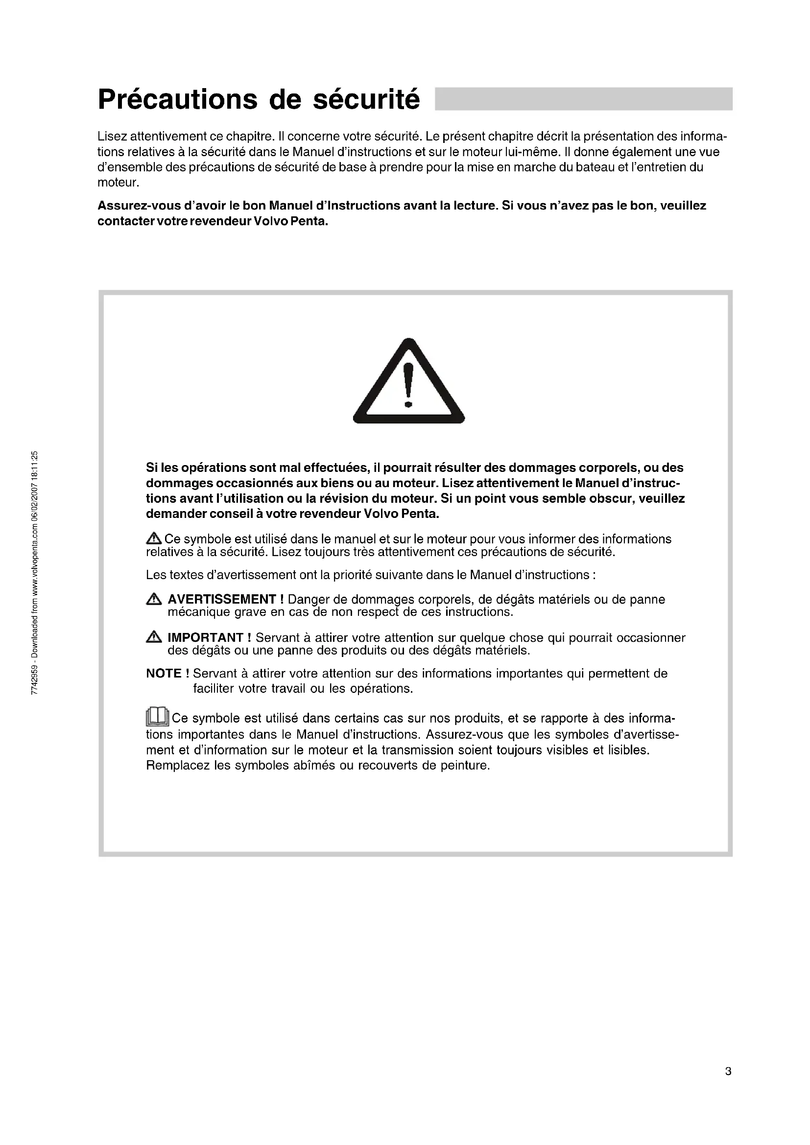Tous droits de modifications réservés. Imprimé sur papier recyclable. (Couverture: Sjöfartverket, autorisation 9809095) Table des matières 7742959 - Downloaded from www.volvopenta.com 06/02/2007 18:11:253 Précautions de sécurité Lisez attentivement ce chapitre. Il concerne votre sécurité. Le présent chapitre décrit la présentation des informa- tions relatives à la sécurité dans le Manuel d’instructions et sur le moteur lui-même. Il donne également une vue d’ensemble des précautions de sécurité de base à prendre pour la mise en marche du bateau et l’entretien du moteur. Assurez-vous d’avoir le bon Manuel d’Instructions avant la lecture. Si vous n’avez pas le bon, veuillez contacter votre revendeur Volvo Penta. Si les opérations sont mal effectuées, il pourrait résulter des dommages corporels, ou des dommages occasionnés aux biens ou au moteur. Lisez attentivement le Manuel d’instruc- tions avant l’utilisation ou la révision du moteur. Si un point vous semble obscur, veuillez demander conseil à votre revendeur Volvo Penta. Ce symbole est utilisé dans le manuel et sur le moteur pour vous informer des informations relatives à la sécurité. Lisez toujours très attentivement ces précautions de sécurité. Les textes d’avertissement ont la priorité suivante dans le Manuel d’instructions : AVERTISSEMENT ! Danger de dommages corporels, de dégâts matériels ou de panne mécanique grave en cas de non respect de ces instructions. IMPORTANT ! Servant à attirer votre attention sur quelque chose qui pourrait occasionner des dégâts ou une panne des produits ou des dégâts matériels. NOTE ! Servant à attirer votre attention sur des informations importantes qui permettent de faciliter votre travail ou les opérations. Ce symbole est utilisé dans certains cas sur nos produits, et se rapporte à des informa- tions importantes dans le Manuel d’instructions. Assurez-vous que les symboles d’avertisse- ment et d’information sur le moteur et la transmission soient toujours visibles et lisibles. Remplacez les symboles abîmés ou recouverts de peinture. 7742959 - Downloaded from www.volvopenta.com 06/02/2007 18:11:254 Mesures de sécurité à prendre lors de l’utilisation du bateau Votre nouveau bateau Lisez les Manuels d’instructions et les autres informa- tions fournies avec votre nouveau bateau. Apprenez à faire marcher correctement et en toute sécurité le moteur, les commandes ainsi que tout l’équipement. S’il s’agit de votre premier bateau, ou un type de bateau que vous ne connaissez pas, nous vous recommandons d’apprendre à commander le bateau calmement et sans hâte. Familiarisez-vous avec le comportement du bateau à différentes vitesses, conditions climatiques et charges avant de larguer les amarres pour votre premier « vrai » voyage. N’oubliez pas que d’après la loi, la personne qui pilote un bateau doit connaître et respecter les règles relatives au trafic et à la sécurité en mer. Assurez- vous que vous connaissez bien les règles en vigueur et les eaux sur lesquelles vous devez naviguer en contactant les autorités ou l’organisation compéten- tes. Il est fortement conseillé de prendre un cours de manœuvre et de matelotage. Nous vous conseillons de contacter votre organisation maritime locale pour trouver un cours approprié. Accidents Les statistiques montrent qu’une mauvaise mainte- nance des bateaux et moteurs, ainsi qu’un manque d’équipement de sécurité sont souvent la cause d’accidents en mer. Assurez-vous que votre bateau est entretenu confor- mément au Manuel d’instructions approprié, et que l’équipement de sécurité nécessaire se trouve à bord et est utilisable. Liste de contrôle quotidienne Prenez l’habitude de contrôler visuellement le moteur et le compartiment moteur avant la mise en marche du bateau (avant le démarrage du moteur), et après la mise en marche du moteur (après l’arrêt du moteur). Ceci vous permettra de détecter rapidement toute fuite de carburant, de réfrigérant et d’huile, ainsi que toute autre anomalie déjà présente ou imminente. Manœuvre Evitez les changements brusques de vitesse et de trajectoire. Ceci pourrait déséquilibrer une personne présente sur le bateau et la faire tomber ou la projeter à l’eau. L’hélice en mouvement peut provoquer de graves blessures. Vérifiez bien que personne ne se trouve dans l’eau avant de vous engager en avant ou en arrière. Ne naviguez jamais près des baigneurs ou dans des zones susceptibles d’accueillir des bai- gneurs. Evitez de trop équilibrer une transmission hors bord, ce qui réduirait trop la direction. Remplissage de carburant Lors du remplissage de carburant, il existe toujours un danger d’incendie et d’explosion. Il est interdit de fumer, et le moteur doit être coupé. Ne remplissez jamais trop le réservoir. Fermez correctement le bouchon de remplissage du réservoir de carburant. Utilisez seulement le carburant préconisé dans le Manuel d’instructions. Une qualité d’huile incorrecte peut entraîner des problèmes de fonctionnement et un arrêt du moteur. Dans le cas d’un moteur diesel, l’utilisation de carburant de mauvaise qualité peut provoquer le grippage de la bielle de commande et l’emballage du moteur, avec le risque supplémentaire de dommages au moteur et de dommages corporels. Ne démarrez pas le moteur Ne démarrez pas ou ne faites pas tourner le moteur en cas de risque imminent de fuite de carburant ou de gazole dans le bateau, à proximité de produits explosifs etc. Un envi- ronnement comportant des explosifs implique un risque d’incendie et/ou d’explosion. Précautions de sécurité 7742959 - Downloaded from www.volvopenta.com 06/02/2007 18:11:255 Empoisonnement au monoxyde de carbone Lorsqu’un bateau se déplace vers l’avant, des remous se forment derrière le bateau. Parfois, ces remous sont tellement puissants, que les gaz d’éc