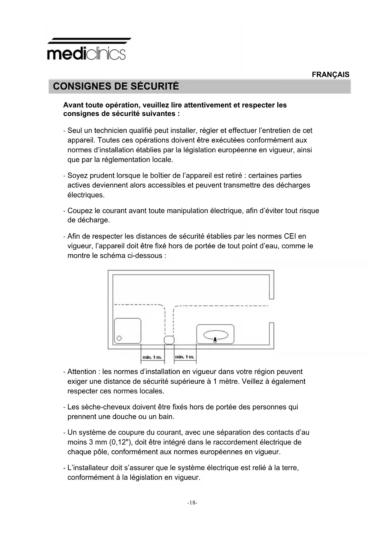 Avant toute opération, veuillez lire attentivement et respecter les consignes de sécurité suivantes : - Seul un technicien qualifié peut installer, régler et effectuer l’entretien de cet appareil. Toutes ces opérations doivent être exécutées conformément aux normes d’installation établies par la législation européenne en vigueur, ainsi que par la réglementation locale. - Soyez prudent lorsque le boîtier de l’appareil est retiré : certaines parties actives deviennent alors accessibles et peuvent transmettre des décharges électriques. - Coupez le courant avant toute manipulation électrique, afin d’éviter tout risque de décharge. - Afin de respecter les distances de sécurité établies par les normes CEI en vigueur, l’appareil doit être fixé hors de portée de tout point d’eau, comme le montre le schéma ci-dessous : - Attention : les normes d’installation en vigueur dans votre région peuvent exiger une distance de sécurité supérieure à 1 mètre. Veillez à également respecter ces normes locales. - Les sèche-cheveux doivent être fixés hors de portée des personnes qui prennent une douche ou un bain. - Un système de coupure du courant, avec une séparation des contacts d’au moins 3 mm (0,12"), doit être intégré dans le raccordement électrique de chaque pôle, conformément aux normes européennes en vigueur. - L’installateur doit s’assurer que le système électrique est relié à la terre, conformément à la législation en vigueur.