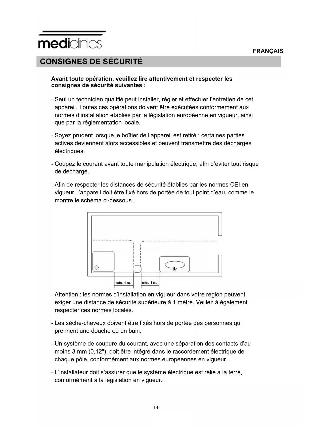 Avant toute opération, veuillez lire attentivement et respecter les consignes de sécurité suivantes : - Seul un technicien qualifié peut installer, régler et effectuer l’entretien de cet appareil. Toutes ces opérations doivent être exécutées conformément aux normes d’installation établies par la législation européenne en vigueur, ainsi que par la réglementation locale. - Soyez prudent lorsque le boîtier de l’appareil est retiré : certaines parties actives deviennent alors accessibles et peuvent transmettre des décharges électriques. - Coupez le courant avant toute manipulation électrique, afin d’éviter tout risque de décharge. - Afin de respecter les distances de sécurité établies par les normes CEI en vigueur, l’appareil doit être fixé hors de portée de tout point d’eau, comme le montre le schéma ci-dessous : - Attention : les normes d’installation en vigueur dans votre région peuvent exiger une distance de sécurité supérieure à 1 mètre. Veillez à également respecter ces normes locales. - Les sèche-cheveux doivent être fixés hors de portée des personnes qui prennent une douche ou un bain. - Un système de coupure du courant, avec une séparation des contacts d’au moins 3 mm (0,12"), doit être intégré dans le raccordement électrique de chaque pôle, conformément aux normes européennes en vigueur. - L’installateur doit s’assurer que le système électrique est relié à la terre, conformément à la législation en vigueur.