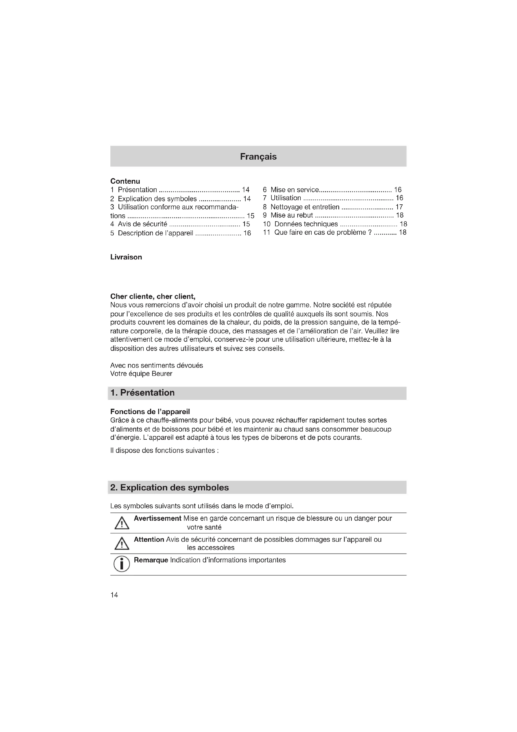 - Les symboles suivants sont utilisés dans le mode d’emploi. Avertissement Mise en garde concernant un risque de blessure ou un danger pour votre santé Attention Avis de sécurité concernant de possibles dommages sur l’appareil ou les accessoires Remarque Indication d’informations importantes Français Contenu 1 Présentation p. 14