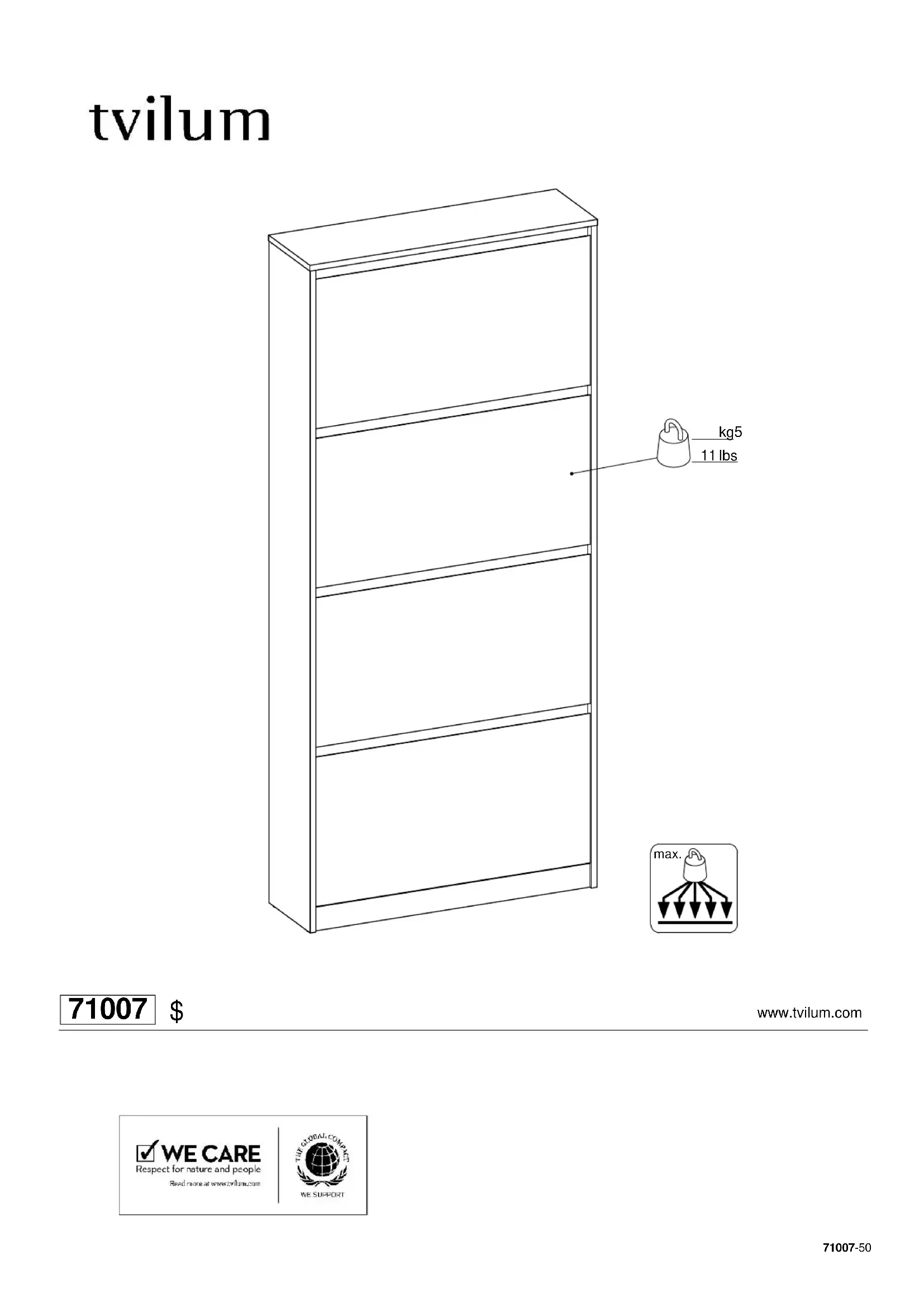 Durant l'assemblage de l'armoire à chaussures, vous ne devez fixer le meuble au mur. En cas de montage incorrect, l'armoire risque de chuter et d'entraîner des dommages matériels et /ou des blessures. TVILUM decline toute responsabilité en cas de blessures ou de dommages matériels dus à un montage mural incorrect.