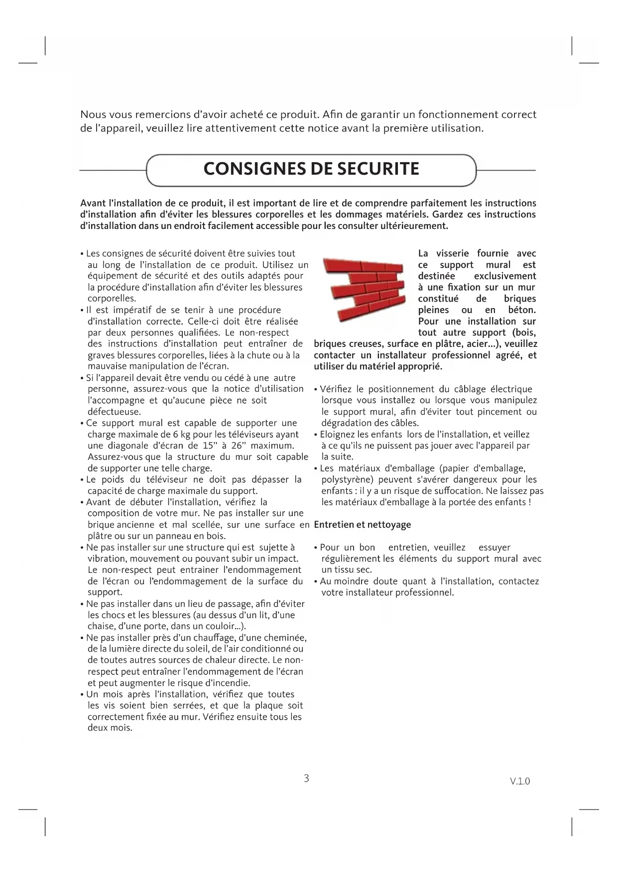 - Un mois après l’installation, vériez que toutes les vis soient bien serrées, et que la plaque soit correctement xée au mur. Vériez ensuite tous les deux mois. La visserie fournie avec ce support mural est destinée exclusivement à une xation sur un mur constitué de briques pleines ou en béton. Pour une installation sur tout autre support (bois, briques creuses, surface en plâtre, acier...), veuillez contacter un installateur professionnel agréé, et utiliser du matériel approprié.