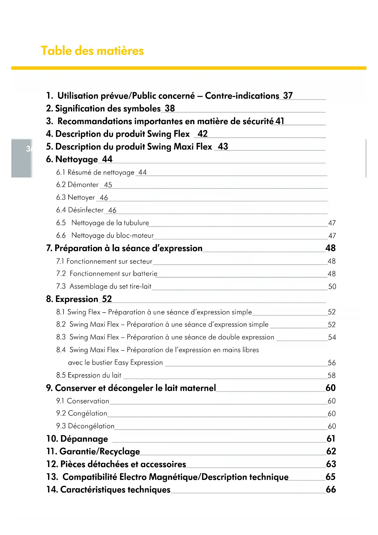 Le non-respect de ces instructions/informations de sécurité peut rendre l’appareil dangereux. Sous réserve de modifications techniques. La déconnexion du secteur n’est assurée que par le débranchement de l’adaptateur secteur de la prise électrique murale. Conservez l’adaptateur secteur éloigné de toute surface chaude. Ne saisissez jamais un appareil électrique qui est tombé dans l’eau. Débranchez-le immédiatement. Ne laissez jamais le tire-lait sans surveillance lorsqu’il est branché sur une alimentation électrique. Risque d’électrocution ! Conservez l’appareil au sec. Ne l’immergez jamais dans de l’eau ou dans d’autres liquides. Le tire-lait Swing Flex/Swing Maxi Flex n’est pas thermorésistant: maintenez-le à distance des radiateurs et flammes nues. N’exposez pas le bloc-moteur à la lumière directe du soleil. N’utilisez jamais un appareil endommagé. Remplacez les pièces abîmées ou usées. MAX. 275 h La durée de vie en fonctionnement du tire-lait SwingFlex est de 275heures. Sagarantie est de deux ans. Toute réparation doit exclusivement être réalisée par un service technique agréé. Ne réparez pas l’appareil vous-même ! Aucune modification de l’appareil n’est autorisée. MAX. 250 h La durée de vie en fonctionnement du tire-lait Swing Maxi Flex est de 250heures. Sagarantie est de deux ans. Produit N’utilisez le tire-lait Swing Flex/Swing Maxi Flex que pour l’usage auquel il est destiné, tel que décrit dans ce manuel. Ne conduisez pas pendant l’expression en mains libres. N’utilisez pas le tire-lait Swing Flex/Swing Maxi Flex lors du bain ou de la douche. Une surveillance est nécessaire lorsque le tire-lait Swing Flex/Swing Maxi Flex est employé à proximité d’enfants. N’utilisez pas le tire-lait Swing Flex/Swing Maxi Flex lorsque vous dormez ou si vous vous sentez très somnolente. En cas de problèmes ou de douleur, contactez un professionnel de santé (consultante en lactation, spécialiste de l’allaitement, etc.). Ce produit est exclusivement réservé à un usage personnel. L’utilisation du même produit par plusieurs personnes peut présenter un risque pour la santé. Les appareils de communication portables et mobiles peuvent avoir un impact sur le fonctionnement du tire-lait Swing Flex/Swing Maxi Flex. Ne faites jamais fonctionner un appareil électrique dont la prise ou le cordon est endommagé, s’il ne fonctionne pas correctement, est tombé, est endommagé ou est tombé dans l’eau. Utilisation Fonctionnement électrique4242
