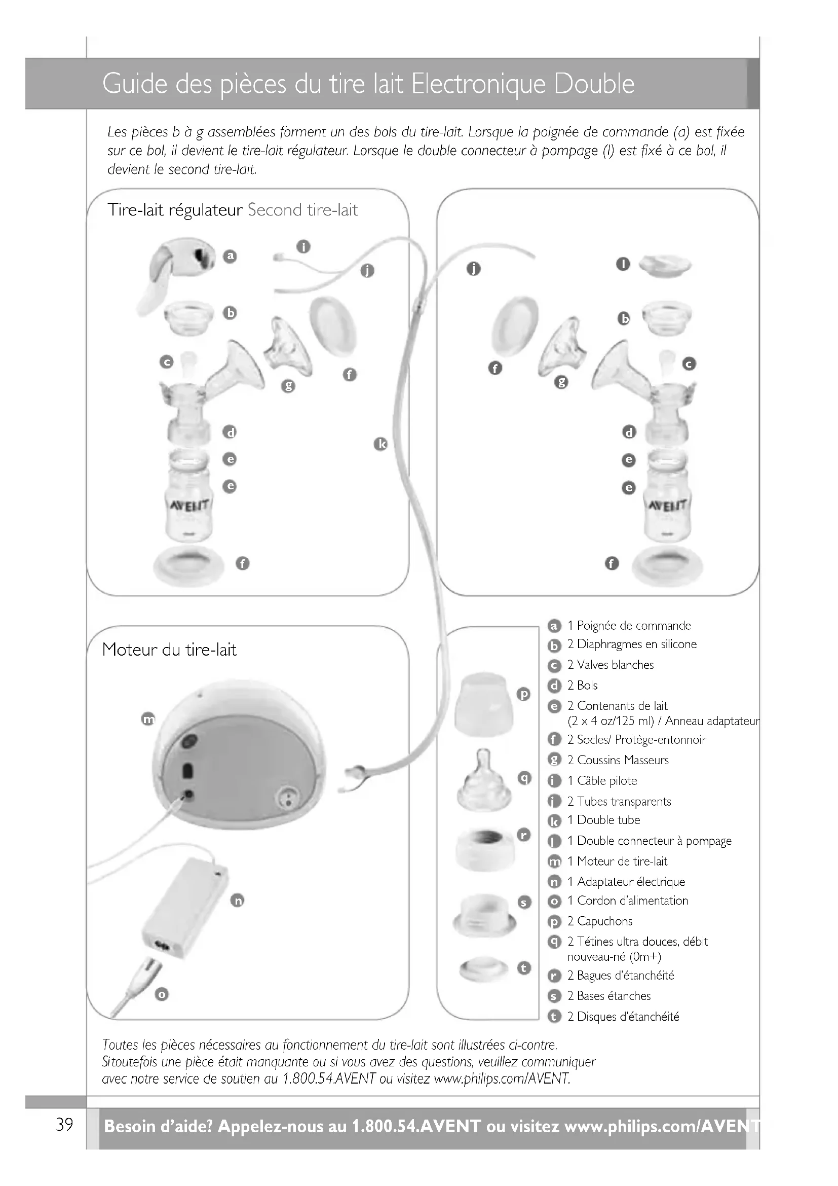 Veuillez prendre le temps de lire attentivement ce feuillet en entier avant d’utiliser votre tire-lait Philips AVENT Electronique Double pour la première fois. CONSERVEZ PRÉCIEUSEMENT CE FEUILLET. À moins d’avis contraire d’un professionnel de la santé, il est préférable d’attendre que votre routine d’allaitement soit bien établie avant d’extraire votre lait – généralement au bout de quatre semaines. Félicitations! Bientôt vous découvrirez ce qui rend votre tire-lait Philips AVENT Electronique Double si unique. Le tire-lait a une mémoire électronique intégrée qui reproduit votre rythme d’extraction en douceur. Vous contrôlez complètement le niveau de votre confort. Ainsi, extraire votre lait avec Philips AVENT Electronique Double vous semblera tout à fait naturel. Le Coussin Masseur est doté de pétales qui massent doucement la région sous le mamelon, entretenant ainsi un débit de lait rapide et régulier. La touche de commande est au bout de vos doigts. Vous pouvez arrêter, mettre en marche ou modifier la vitesse et la puissance d’aspiration sans retirer votre main du tire-lait. La mémoire électronique mémorise vos gestes. Commencez par tirer manuellement, appuyez sur la touche et le tire-lait prend le relais automatiquement. Exprimer, conserver et nourrir grâce à la commodité du système naturel Philips AVENT. Comme les produits s’adaptent les uns aux autres, vous n’avez pas à transvider votre lait d’un contenant à l’autre. Ultra confortable, silencieux et efficace, ce tire-lait vous permet aisément de faire profiter à votre bébé des bienfaits du lait maternel. Contenu: Tire-lait (Simple et double) Guide des pièces du tire lait Electronique Double 39-40 Mises en garde importantes 41 Démonter le tire-lait 43 Nettoyer et désinfecter 44 Préparation pour tirer du lait 45-46 Assembler les bols 47-48 Brancher les composants électroniques 49-50 Tirer du lait avec votre Philips AVENT Electronique Double 51-52 Garder les pièces propres et le tire-lait compact en déplacement 53 Conservation du lait maternel 54-55 Guide de dépannage 56 Données techniques 57 Garantie limitée 57Besoin d’aide? Appelez-nous au 1.800.54.AVENT ou visitez www.philips.com/AVENT