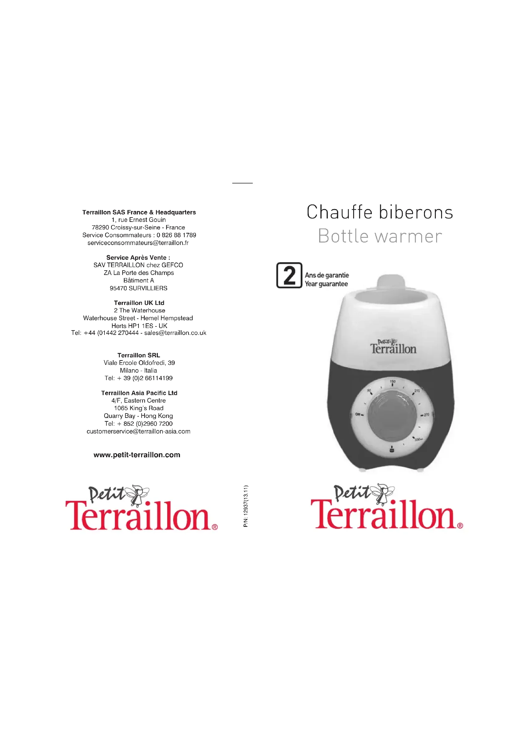 En fin de vie, confier ce produit à un point de collecte pour le recyclage des déchets d’équipements électriques et électroniques. GARANTIE Ce produit est garanti contre les défauts de matériaux et de fabrication. Pendant la période de garantie, de tels défauts seront réparés gratuitement (la preuve d’achat devra être présentée en cas de réclamation sous garantie). Cette garantie ne couvre pas les dommages résultant d’accident, de mauvaise utilisation ou de négligence. En cas de réclamation, contacter en premier lieu le magasin où vous avez effectué votre achat. CJ-955A_—´¸ˆ˚Ø.pdf, Flat 5 of 12 - Pages: 18, 3, 09/01/09 02:57 PM4 Bottle warmer Dear customer, Thank you for purchasing this Terraillon product. We hope you enjoy using the product. In order to be completely satisfied, we recommend that you read these directions carefully.