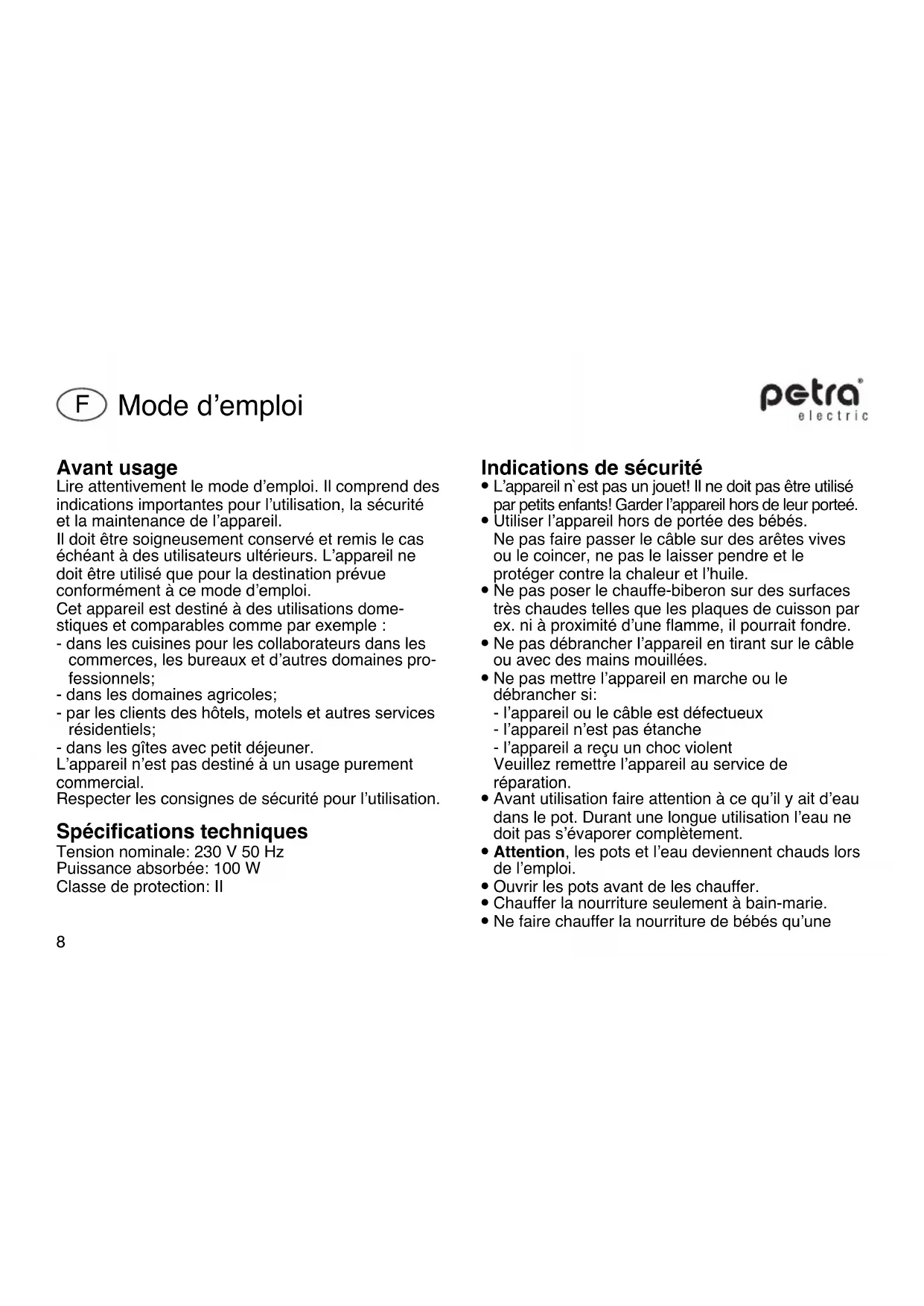 BF1 - Chauffe-bouteille Petra Electric - Notice d'utilisation et mode d'emploi gratuit