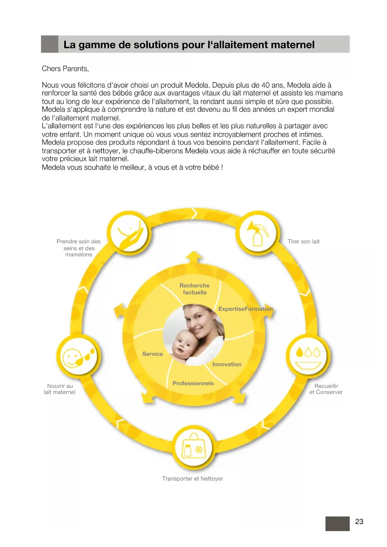 923FR Lagammedesolutionspourl‘allaitementmaternel Chers Parents, Nous vous félicitons d‘avoir choisi un produit Medela. Depuis plus de 40 ans, Medela aide à renforcer la santé des bébés grâce aux avantages vitaux du lait maternel et assiste les mamans tout au long de leur expérience de l‘allaitement, la rendant aussi simple et sûre que possible. Medela s‘applique à comprendre la nature et est devenu au fil des années un expert mondial de l‘allaitement maternel. L‘allaitement est l‘une des expériences les plus belles et les plus naturelles à partager avec votre enfant. Un moment unique où vous vous sentez incroyablement proches et intimes. Medela propose des produits répondant à tous vos besoins pendant l‘allaitement. Facile à transporter et à nettoyer, le chauffe-biberons Medela vous aide à réchauffer en toute sécurité votre précieux lait maternel. Medela vous souhaite le meilleur, à vous et à votre bébé ! Tirer son lait Recueillir et Conserver Transporter et Nettoyer Nourrir au lait maternel Prendre soin des seins et des mamelons Innovation Recherche factuelle Professionnels Service ExpertiseFormation24