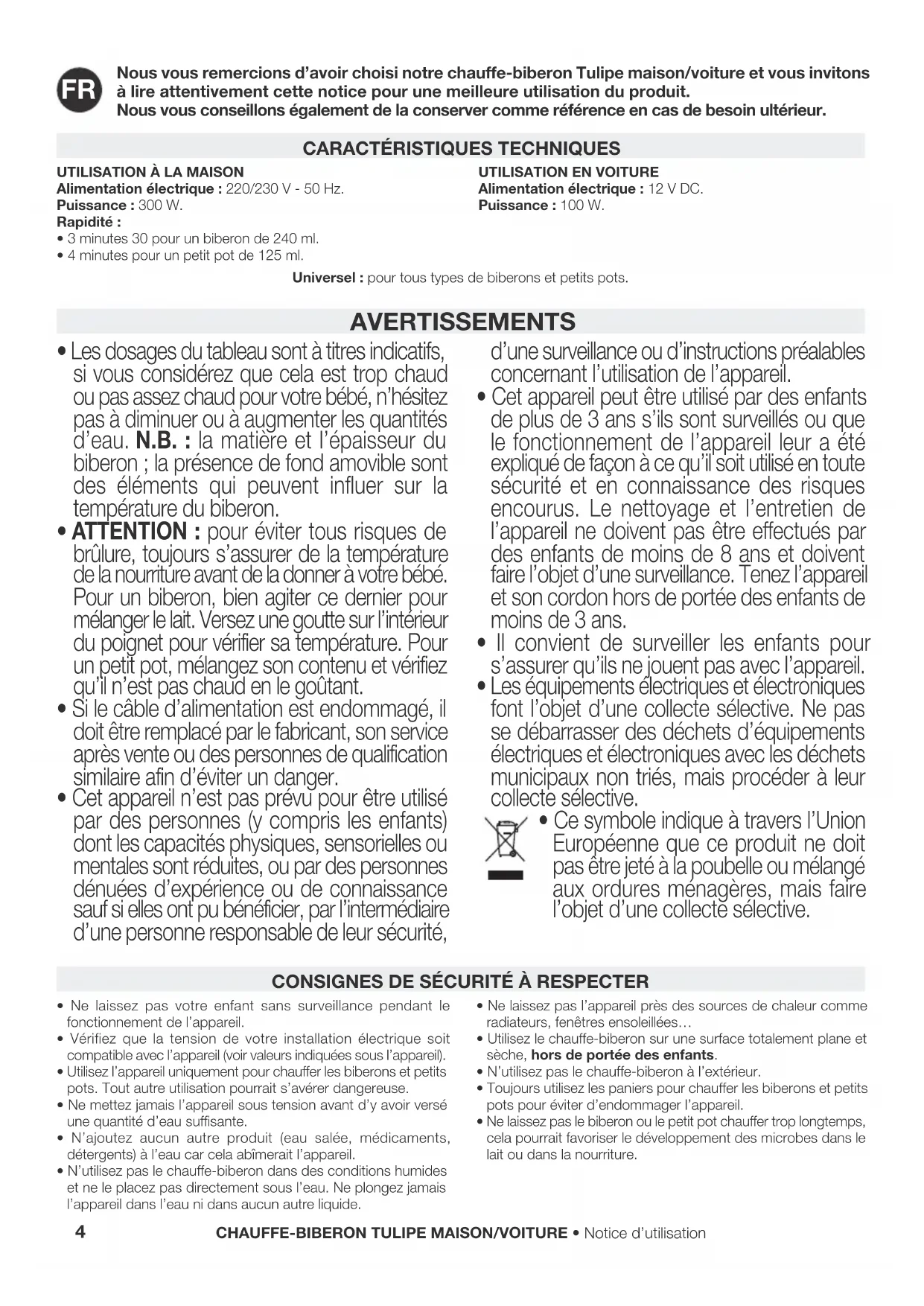- Ce symbole indique à travers l’Union Européenne que ce produit ne doit pas être jeté à la poubelle ou mélangé aux ordures ménagères, mais faire l’objet d’une collecte sélective. UTILISATION À LA MAISONAlimentation électrique : 220/230 V - 50 Hz.Puissance : 300 W.Rapidité :• 3 minutes 30 pour un biberon de 240 ml.• 4 minutes pour un petit pot de 125 ml.UTILISATION EN VOITUREAlimentation électrique : 12 V DC.Puissance : 100 W.