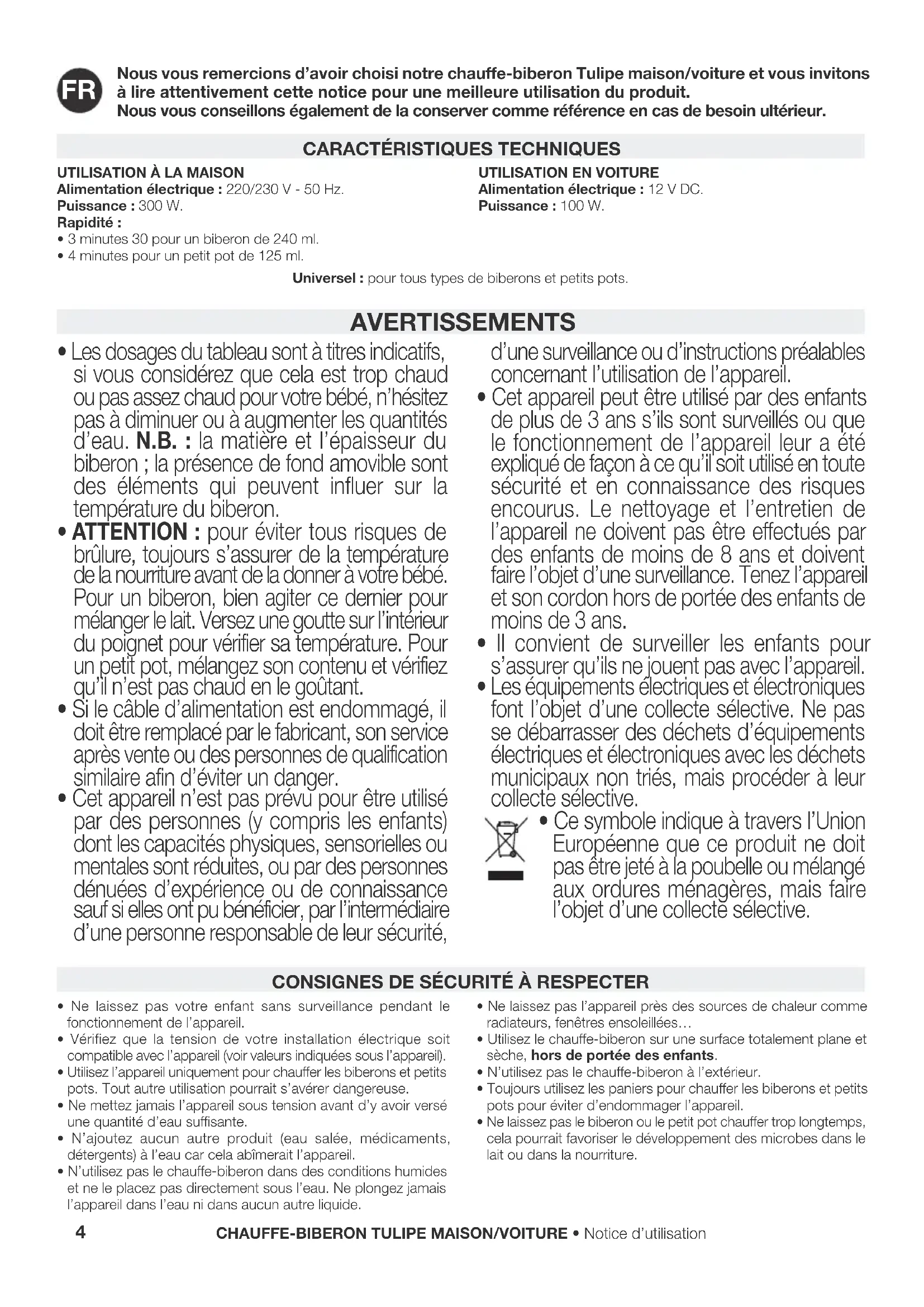 - Ce symbole indique à travers l’Union Européenne que ce produit ne doit pas être jeté à la poubelle ou mélangé aux ordures ménagères, mais faire l’objet d’une collecte sélective. UTILISATION À LA MAISONAlimentation électrique : 220/230 V - 50 Hz.Puissance : 300 W.Rapidité :• 3 minutes 30 pour un biberon de 240 ml.• 4 minutes pour un petit pot de 125 ml.UTILISATION EN VOITUREAlimentation électrique : 12 V DC.Puissance : 100 W.