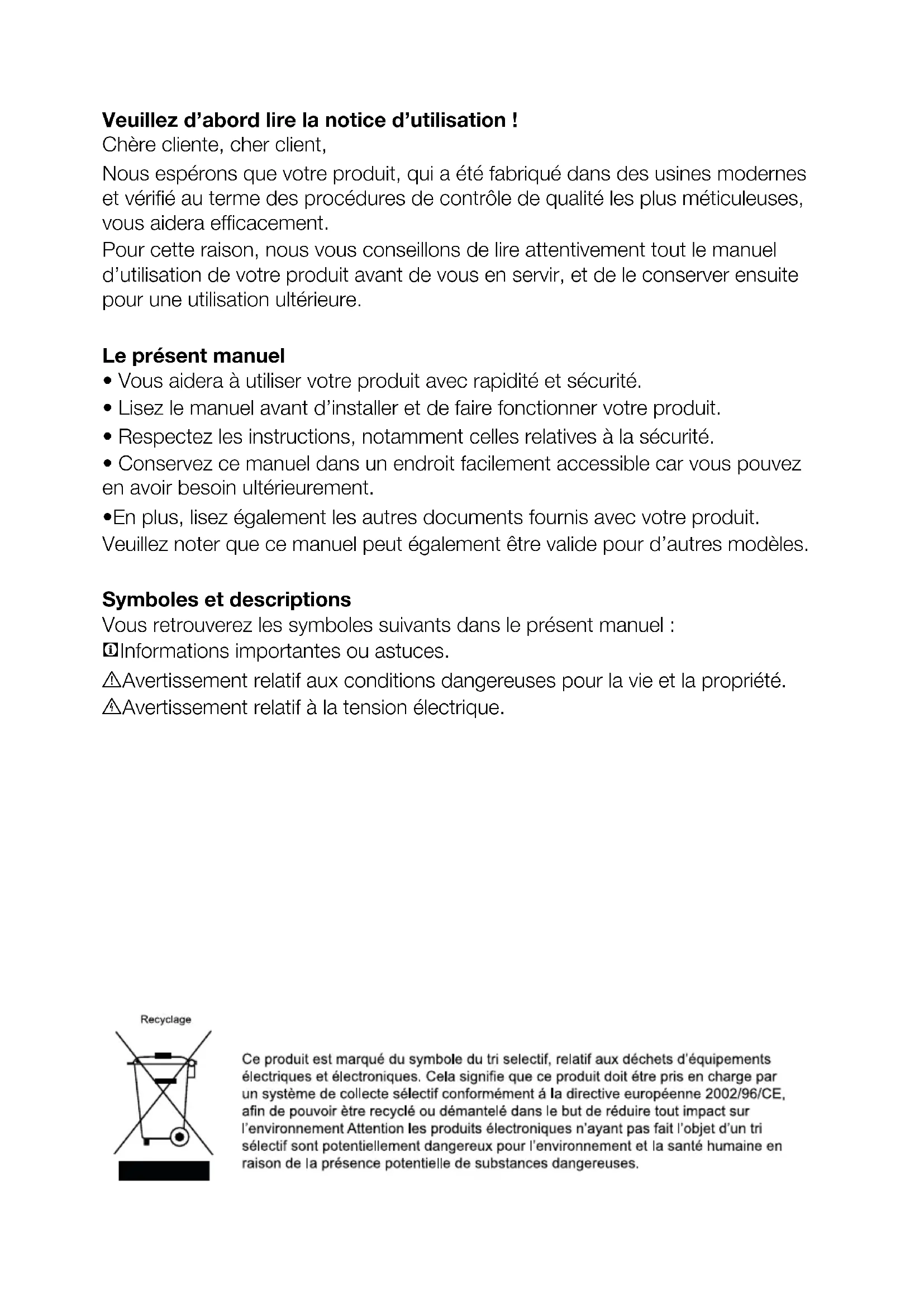 - Lisez le manuel avant d’installer et de faire fonctionner votre produit.