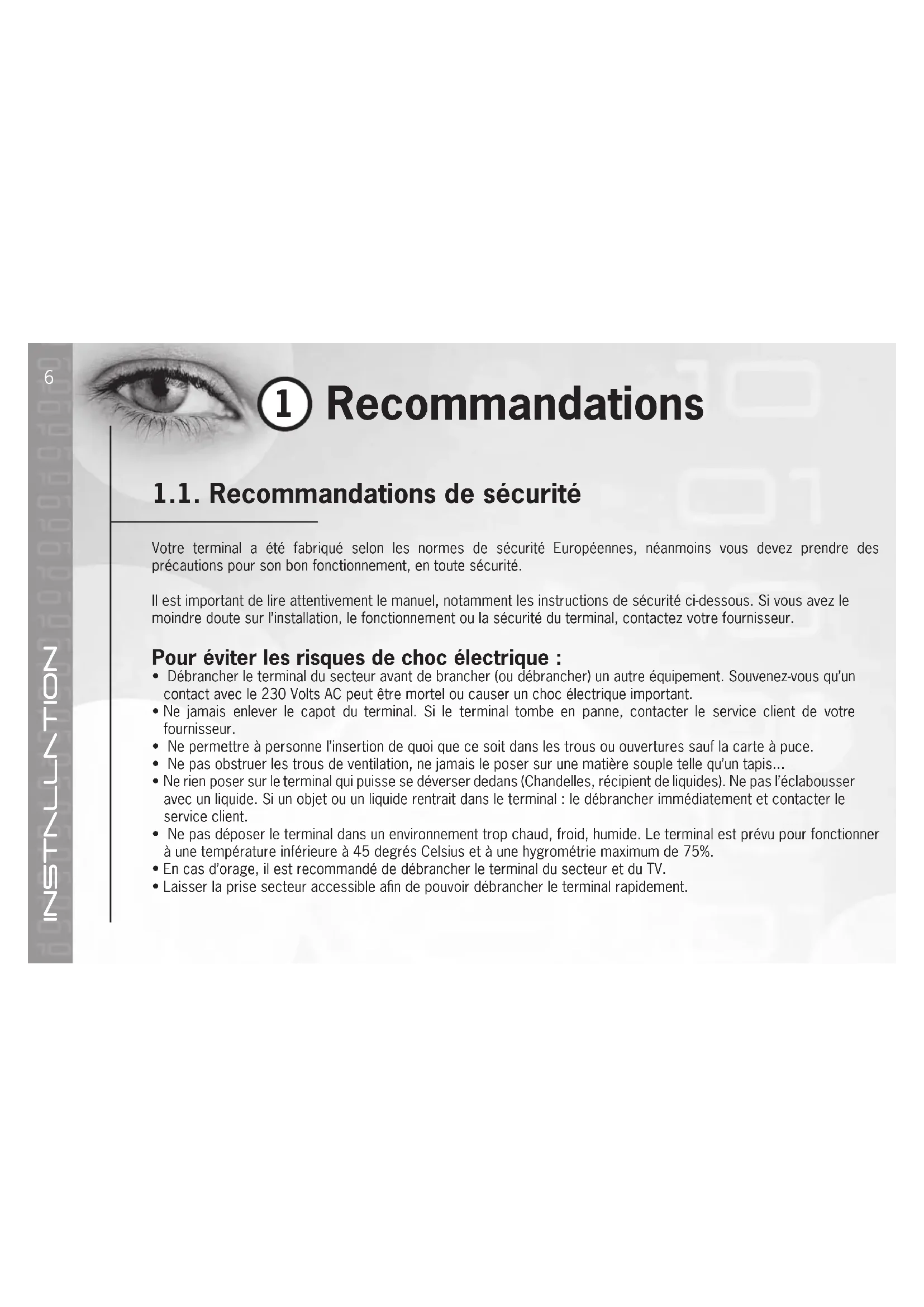 - Ne rien poser sur le terminal qui puisse se déverser dedans (Chandelles, récipient de liquides). Ne pas l'éclabousser avec un liquide. Si un objet ou un liquide rentrait dans le terminal : le débrancher immédiatement et contacter le service client.