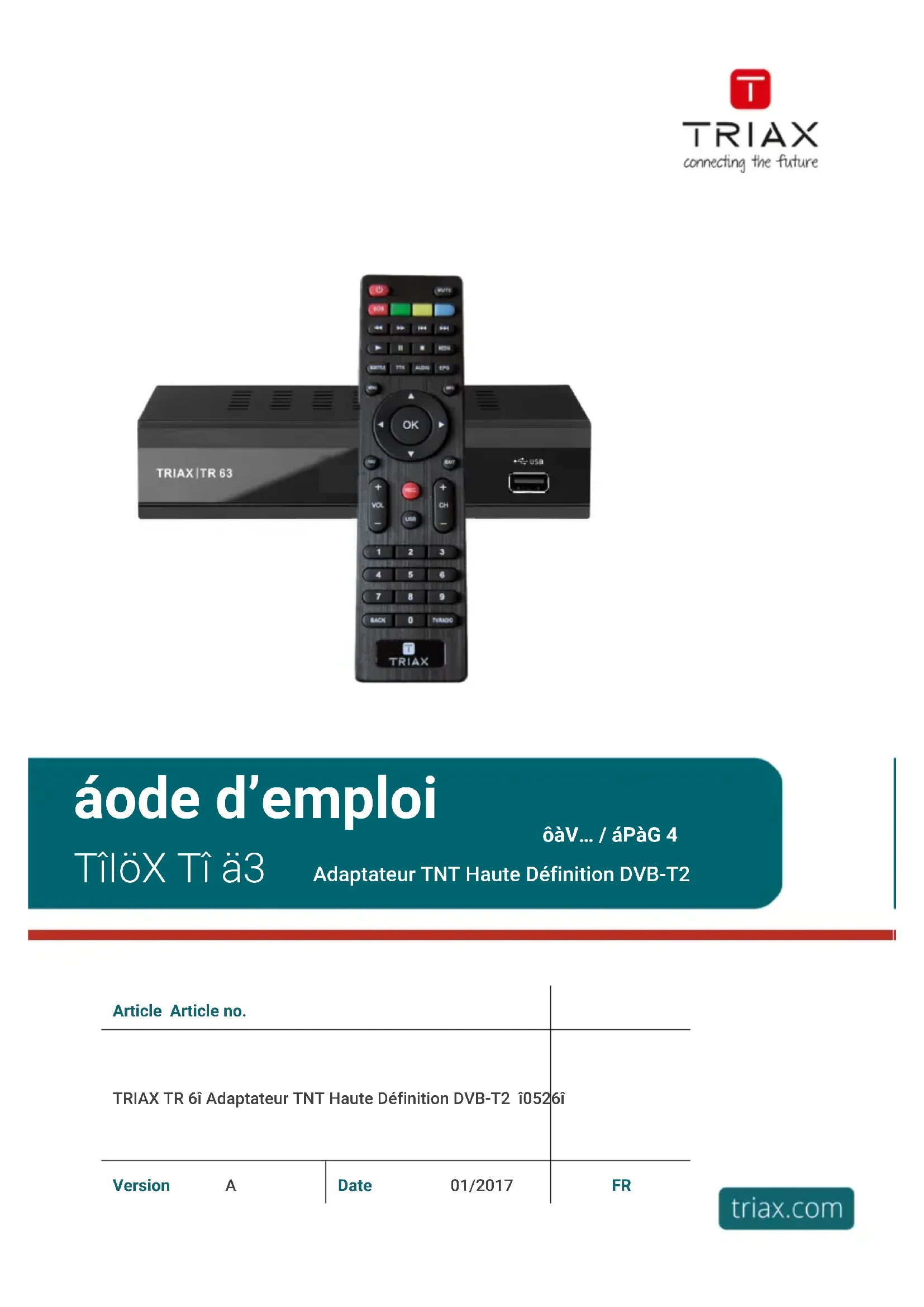 Téléchargez la notice de votre Recepteur au format PDF gratuitement ! Retrouvez votre notice TR 63 - TRIAX et reprennez votre appareil électronique en main. Sur cette page sont publiés tous les documents nécessaires à l'utilisation de votre appareil TR 63 de la marque TRIAX.