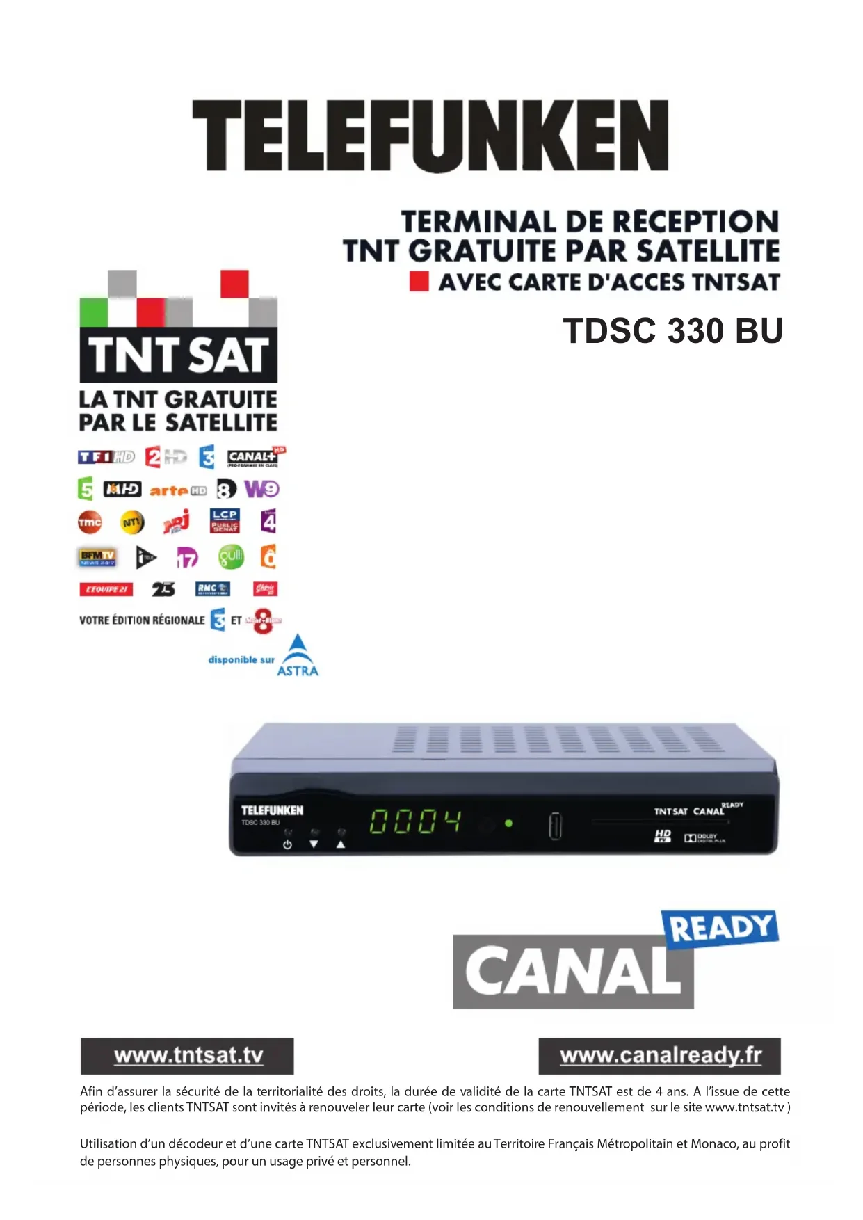 Utilisation d'un decodeur et d'une carte TNTSAT exclusivement limitée au Territoire Français Métropolitain et Monaco, au profit de personnes physiques, pour un usage privé et personnel.