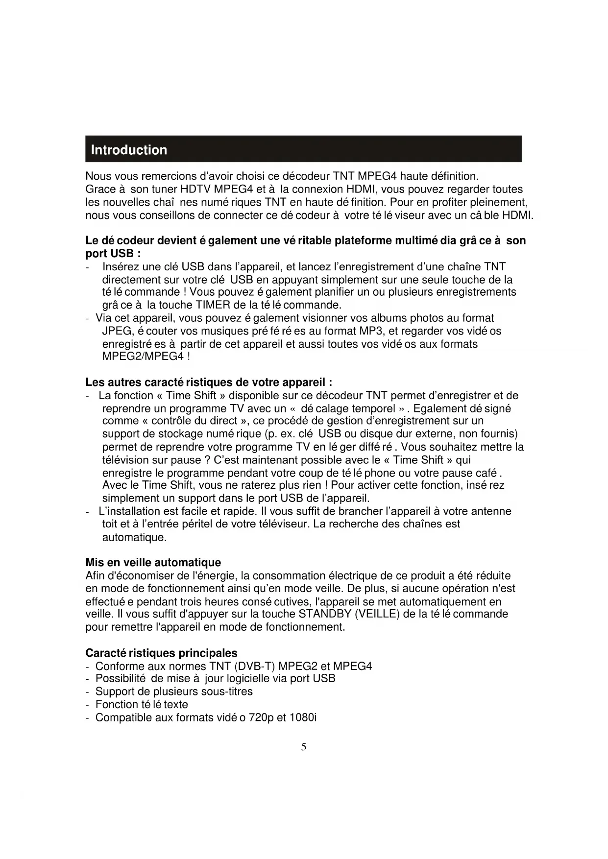Introduction Nous vous remercions d’avoir choisi ce décodeur TNT MPEG4 haute définition. Grace à son tuner HDTV MPEG4 et à la connexion HDMI, vous pouvez regarder toutes les nouvelles chaînes numériques TNT en haute définition. Pour en profiter pleinement, nous vous conseillons de connecter ce décodeur à votre téléviseur avec un câble HDMI. Le décodeur devient également une véritable plateforme multimédia grâce à son port USB : - Insérez une clé USB dans l’appareil, et lancez l’enregistrement d’une chaîne TNT directement sur votre clé USB en appuyant simplement sur une seule touche de la télécommande ! Vous pouvez également planifier un ou plusieurs enregistrements grâce à la touche TIMER de la télécommande. - Via cet appareil, vous pouvez également visionner vos albums photos au format JPEG, écouter vos musiques préférées au format MP3, et regarder vos vidéos enregistrées à partir de cet appareil et aussi toutes vos vidéos aux formats MPEG2/MPEG4 ! Les autres caractéristiques de votre appareil : - La fonction « Time Shift » disponible sur ce décodeur TNT permet d’enregistrer et de reprendre un programme TV avec un « décalage temporel ». Egalement désigné comme « contrôle du direct », ce procédé de gestion d’enregistrement sur un support de stockage numérique (p. ex. clé USB ou disque dur externe, non fournis) permet de reprendre votre programme TV en léger différé. Vous souhaitez mettre la télévision sur pause ? C’est maintenant possible avec le « Time Shift » qui enregistre le programme pendant votre coup de téléphone ou votre pause café. Avec le Time Shift, vous ne raterez plus rien ! Pour activer cette fonction, insérez simplement un support dans le port USB de l’appareil. - L’installation est facile et rapide. Il vous suffit de brancher l’appareil à votre antenne toit et à l’entrée péritel de votre téléviseur. La recherche des chaînes est automatique. Mis en veille automatique Afin d'économiser de l'énergie, la consommation électrique de ce produit a été réduite en mode de fonctionnement ainsi qu’en mode veille. De plus, si aucune opération n'est effectuée pendant trois heures consécutives, l'appareil se met automatiquement en veille. Il vous suffit d'appuyer sur la touche STANDBY (VEILLE) de la télécommande pour remettre l'appareil en mode de fonctionnement. Caractéristiques principales - Conforme aux normes TNT (DVB-T) MPEG2 et MPEG4 - Possibilité de mise à jour logicielle via port USB - Support de plusieurs sous-titres - Fonction télétexte - Compatible aux formats vidéo 720p et 1080i6 - Connexion HDMI - Prise péritel - Entrée et sortie antenne toit Contenu de l’emballage Avant l'installation, veuillez bien vérifier si vous avez les éléments suivants : - Un décodeur TNT - Une télécommande - Un manuel d'utilisation7