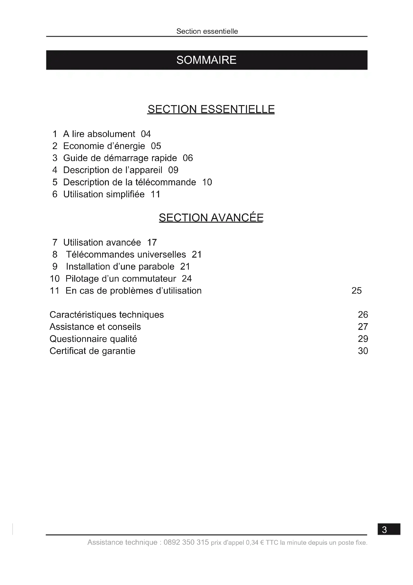 7 Utilisation avancée 17 8 Télécommandes universelles 21 9 Installation d’une parabole 21 10 Pilotage d’un commutateur 24 11 En cas de problèmes d’utilisation 25 Caractéristiques techniques 26 Assistance et conseils 27 Questionnaire qualité 29 Certificat de garantie 30 SOMMAIREAssistance technique : 0892 350 315 prix d’appel 0,34 € TTC la minute depuis un poste fixe.