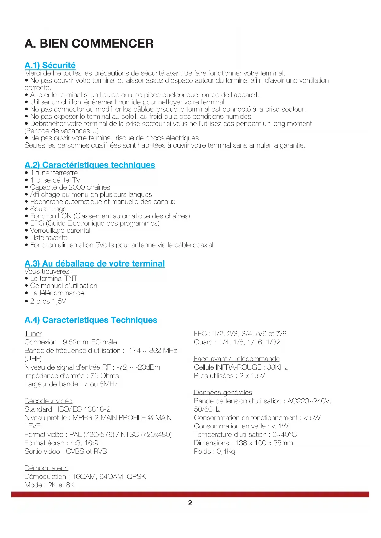 - 2 piles 1,5V A.4) Caracteristiques Techniques Tuner Connexion : 9,52mm IEC mâle Bande de fréquence d’utilisation : 174 ~ 862 MHz (UHF) Niveau de signal d’entrée RF : -72 ~ -20dBm Impédance d’entrée : 75 Ohms Largeur de bande : 7 ou 8MHz Décodeur vidéo Standard : ISO/IEC 13818-2 Niveau profi le : MPEG-2 MAIN PROFILE @ MAIN LEVEL Format vidéo : PAL (720x576) / NTSC (720x480) Format écran : 4:3, 16:9 Sortie vidéo : CVBS et RVB Démodulateur Démodulation : 16QAM, 64QAM, QPSK Mode : 2K et 8K FEC : 1/2, 2/3, 3/4, 5/6 et 7/8 Guard : 1/4, 1/8, 1/16, 1/32 Face avant / Télécommande Cellule INFRA-ROUGE : 38KHz Piles utilisées : 2 x 1,5V Données générales Bande de tension d’utilisation : AC220~240V, 50/60Hz Consommation en fonctionnement : < 5W Consommation en veille : < 1W Température d’utilisation : 0~40°C Dimensions : 138 x 100 x 35mm Poids : 0,4Kg3 B. DESCRIPTION B.1) La face avant