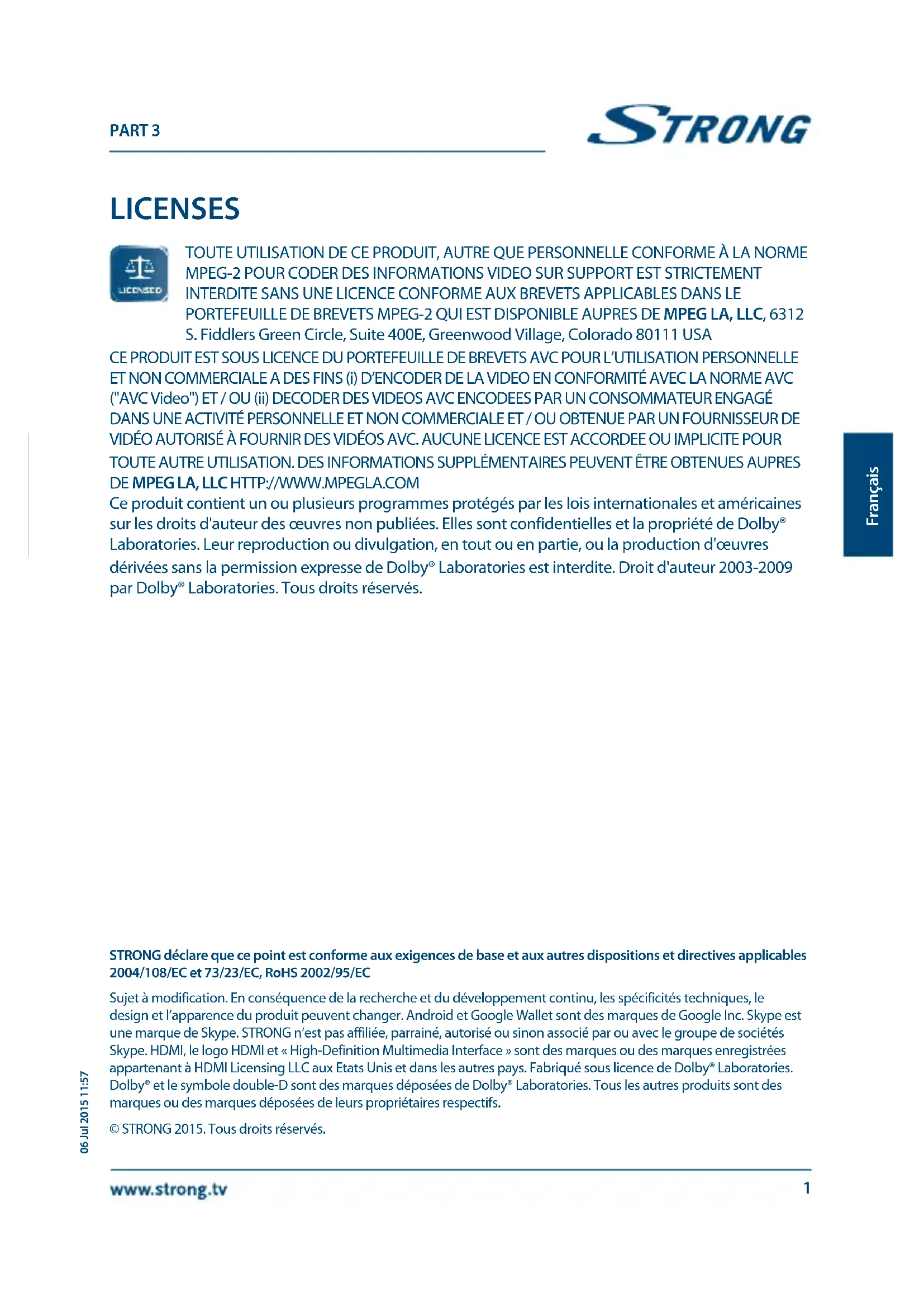 support_it@strong.tv Da rete fissa 24,8 cent. al min. 12,5 cent. scatto alla risposta Da rete mobile max 49 cent. al min. 15,6 cent. scatto alla risposta Supplied by STRONG & Co, Japan Represented by STRONG Ges.m.b.H. Franz-Josefs-Kai 1 1010 Vienna Austria Email: support_at@strong.tvLICENSES TOUTE UTILISATION DE CE PRODUIT, AUTRE QUE PERSONNELLE CONFORME À LA NORME MPEG-2 POUR CODER DES INFORMATIONS VIDEO SUR SUPPORT EST STRICTEMENT INTERDITE SANS UNE LICENCE CONFORME AUX BREVETS APPLICABLES DANS LE PORTEFEUILLE DE BREVETS MPEG-2 QUI EST DISPONIBLE AUPRES DE MPEG LA, LLC, 6312 S. Fiddlers Green Circle, Suite 400E, Greenwood Village, Colorado 80111 USA CE PRODUIT EST SOUS LICENCE DU PORTEFEUILLE DE BREVETS AVC POUR L’UTILISATION PERSONNELLE ET NON COMMERCIALE A DES FINS (i) D‘ENCODER DE LA VIDEO EN CONFORMITÉ AVEC LA NORME AVC ("AVC Video") ET / OU (ii) DECODER DES VIDEOS AVC ENCODEES PAR UN CONSOMMATEUR ENGAGÉ DANS UNE ACTIVITÉ PERSONNELLE ET NON COMMERCIALE ET / OU OBTENUE PAR UN FOURNISSEUR DE VIDÉO AUTORISÉ À FOURNIR DES VIDÉOS AVC. AUCUNE LICENCE EST ACCORDEE OU IMPLICITE POUR TOUTE AUTRE UTILISATION. DES INFORMATIONS SUPPLÉMENTAIRES PEUVENT ÊTRE OBTENUES AUPRES DE MPEG LA, LLC HTTP://WWW.MPEGLA.COM Ce produit contient un ou plusieurs programmes protégés par les lois internationales et américaines sur les droits d'auteur des œuvres non publiées. Elles sont confidentielles et la propriété de Dolby® Laboratories. Leur reproduction ou divulgation, en tout ou en partie, ou la production d'œuvres dérivées sans la permission expresse de Dolby® Laboratories est interdite. Droit d'auteur 2003-2009 par Dolby® Laboratories. Tous droits réservés. 06 Jul 2015 11:57 STRONG déclare que ce point est conforme aux exigences de base et aux autres dispositions et directives applicables 2004/108/EC et 73/23/EC, RoHS 2002/95/EC Sujet à modification. En conséquence de la recherche et du développement continu, les spécificités techniques, le design et l’apparence du produit peuvent changer. Android et Google Wallet sont des marques de Google Inc. Skype est une marque de Skype. STRONG n’est pas affiliée, parrainé, autorisé ou sinon associé par ou avec le groupe de sociétés Skype. HDMI, le logo HDMI et « High-Definition Multimedia Interface » sont des marques ou des marques enregistrées appartenant à HDMI Licensing LLC aux Etats Unis et dans les autres pays. Fabriqué sous licence de Dolby® Laboratories. Dolby® et le symbole double-D sont des marques déposées de Dolby® Laboratories. Tous les autres produits sont des marques ou des marques déposées de leurs propriétaires respectifs. © STRONG 2015. Tous droits réservés.