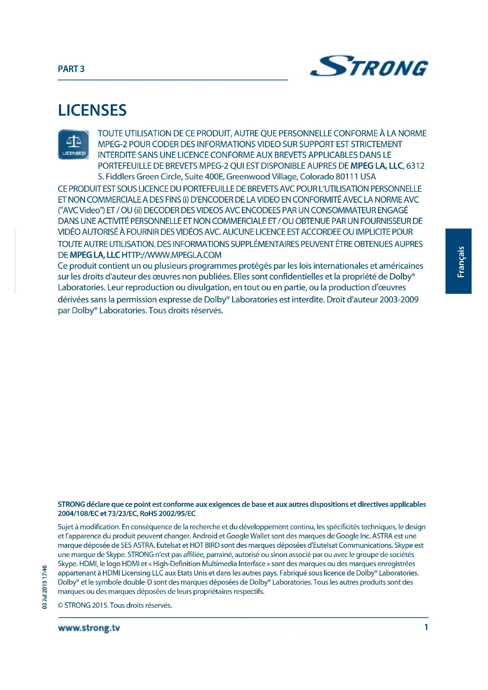 Sujet à modification. En conséquence de la recherche et du développement continu, les spécificités techniques, le design et l'apparence du produit peuvent changer. Android et Google Wallet sont des marques de Google Inc. ASTRA est une marque déposée de SES ASTRA. Eutelsat et HOT BIRD sont des marques déposées d'Eutelsat Communications. Skype est une marque de Skype. STRONG n'est pas affiliée, parrainée, autorisée ou sinon associée par ou avec le groupe de sociétés Skype. HDMI, le logo HDMI et « High-Definition Multimedia Interface » sont des marques ou des marques enregistrées appartenant à HDMI Licensing LLC aux États-Unis et dans les autres pays. Fabriqué sous licence de Dolby® Laboratories. Dolby® et le symbole double-D sont des marques déposées de Dolby® Laboratories. Tous les autres produits sont des marques ou des marques déposées de leurs propriétaires respectifs.