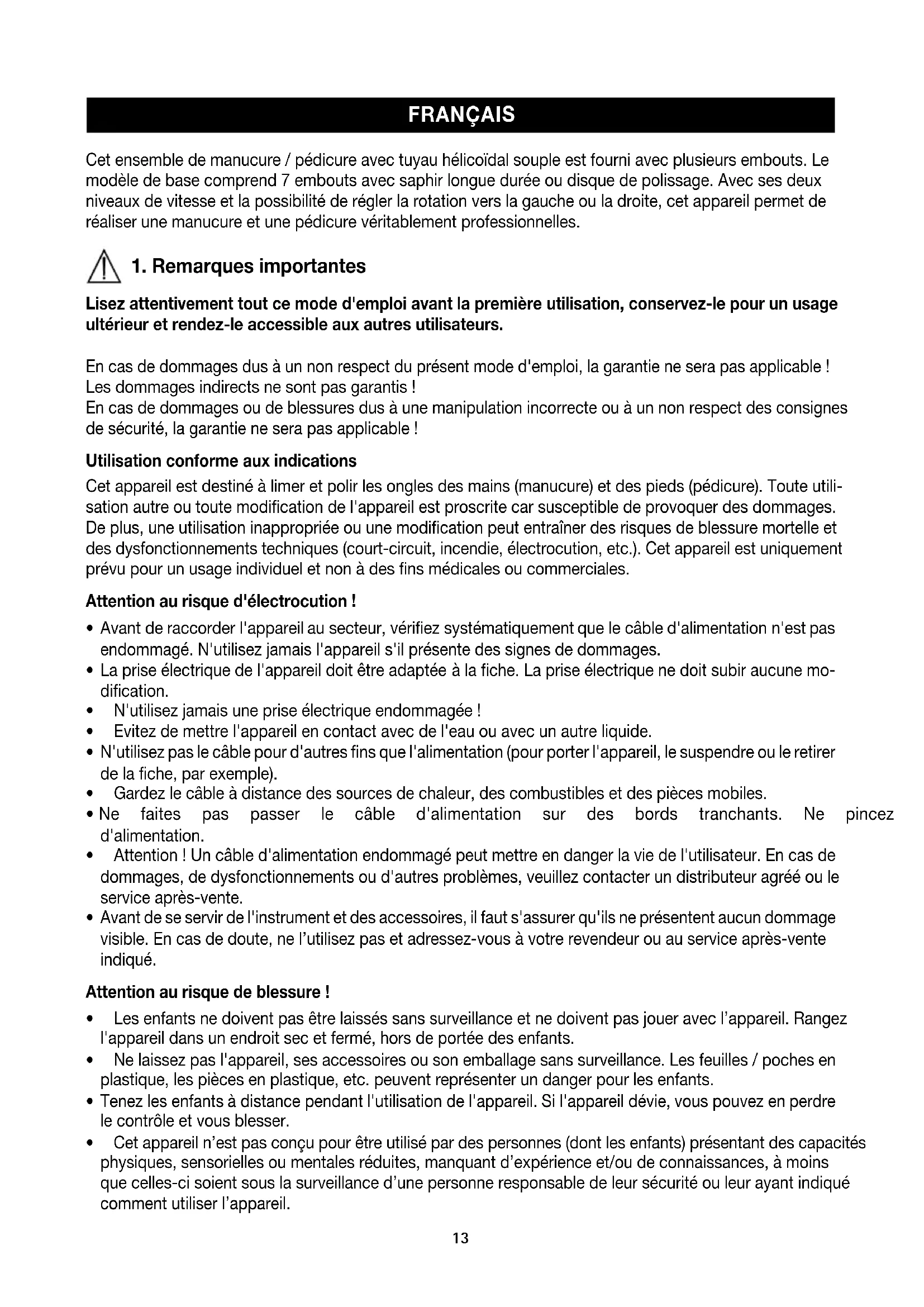 Lisez attentivement tout ce mode d'emploi avant la première utilisation, conservez-le pour un usage ultérieur et rendez-le accessible aux autres utilisateurs. En cas de dommages dus à un non respect du présent mode d'emploi, la garantie ne sera pas applicable ! Les dommages indirects ne sont pas garantis ! En cas de dommages ou de blessures dus à une manipulation incorrecte ou à un non respect des consignes de sécurité, la garantie ne sera pas applicable ! Utilisation conforme aux indications Cet appareil est destiné à limer et polir les ongles des mains (manucure) et des pieds (pédicure). Toute utili- sation autre ou toute modification de l'appareil est proscrite car susceptible de provoquer des dommages. De plus, une utilisation inappropriée ou une modification peut entraîner des risques de blessure mortelle et des dysfonctionnements techniques (court-circuit, incendie, électrocution, etc.). Cet appareil est uniquement prévu pour un usage individuel et non à des fins médicales ou commerciales. Attention au risque d'électrocution !