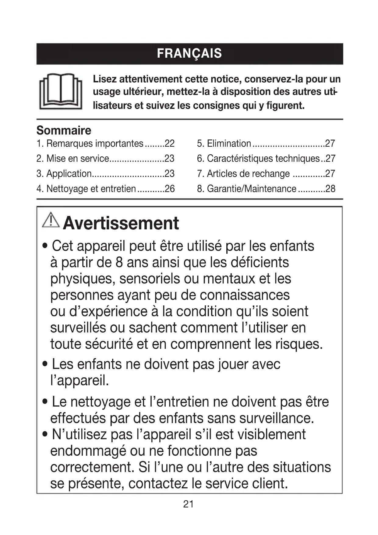 - N’utilisez pas l’appareil s’il est visiblement endommagé ou ne fonctionne pas correctement. Si l’une ou l’autre des situations se présente, contactez le service client. Sommaire 1. Remarques importantes ........222. Mise en service ......................233. Application.............................234. Nettoyage et entretien ...........265. Elimination .............................276. Caractéristiques techniques ..277. Articles de rechange .............278. Garantie/Maintenance ...........28 Lisez attentivement cette notice, conservez-la pour un usage ultérieur, mettez-la à disposition des autres uti