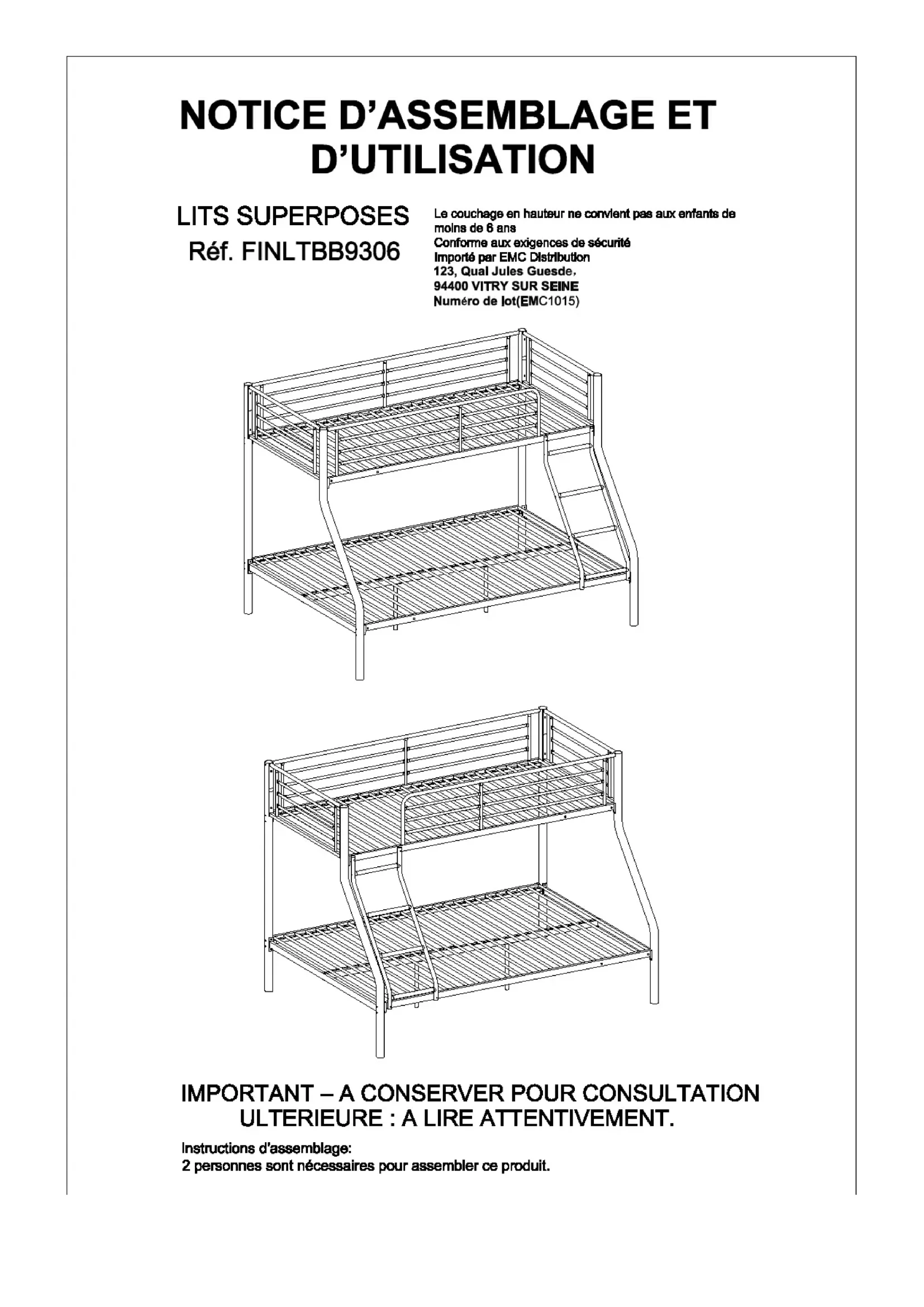 Le couchage en hauteur ne convient pas aux enfants de moins de 6 ans Conforme aux exigences de sécurité Importé par EMC Distribution 123, Qual Jules Guesde, 94400 VITRY SUR SEINE Numéro de lot(EMC1015)