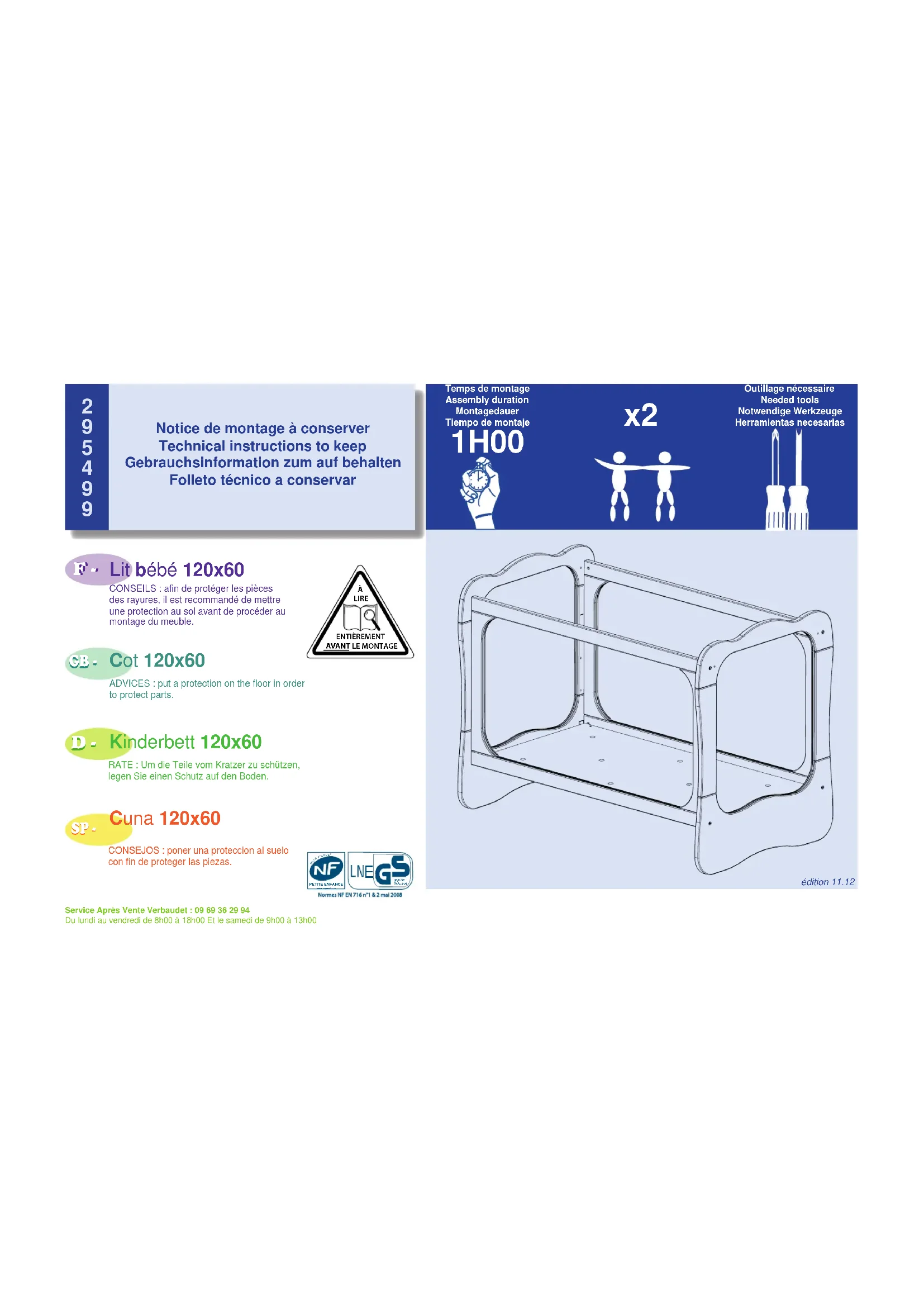 Notice de montage à conserverTechnical instructions to keepGebrauchsinformation zum auf behaltenFolleto técnico a conservar SP - SP - D - D - GB - GB - F - F - CONSEILS : afin de protéger les pièces des rayures, il est recommandé de mettre une protection au sol avant de procéder au montage du meuble.ADVICES : put a protection on the floor in order to protect parts.RATE : Um die Teile vom Kratzer zu schützen, legen Sie einen Schutz auf den Boden.CONSEJOS : poner una proteccion al suelo con fin de proteger las piezas.Service Après Vente Verbaudet : 09 69 36 29 94Du lundi au vendredi de 8h00 à 18h00 Et le samedi de 9h00 à 13h00 geprüfteSicherheitPETITE ENFANCEwww.marque-nf.com