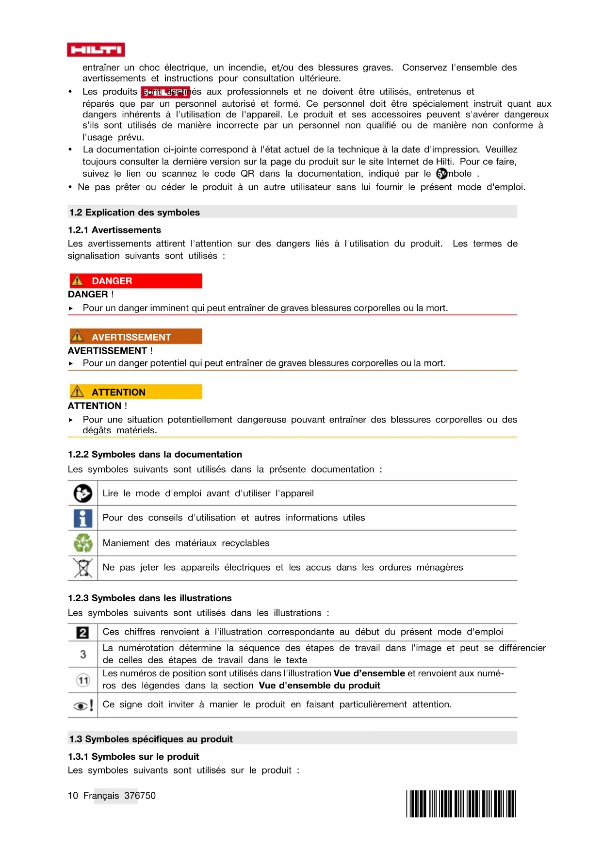- La documentation ci-jointe correspond à l'état actuel de la technique à la date d'impression. Veuillez toujours consulter la dernière version sur la page du produit sur le site Internet de Hilti. Pour ce faire, suivez le lien ou scannez le code QR dans la documentation, indiqué par le symbole .