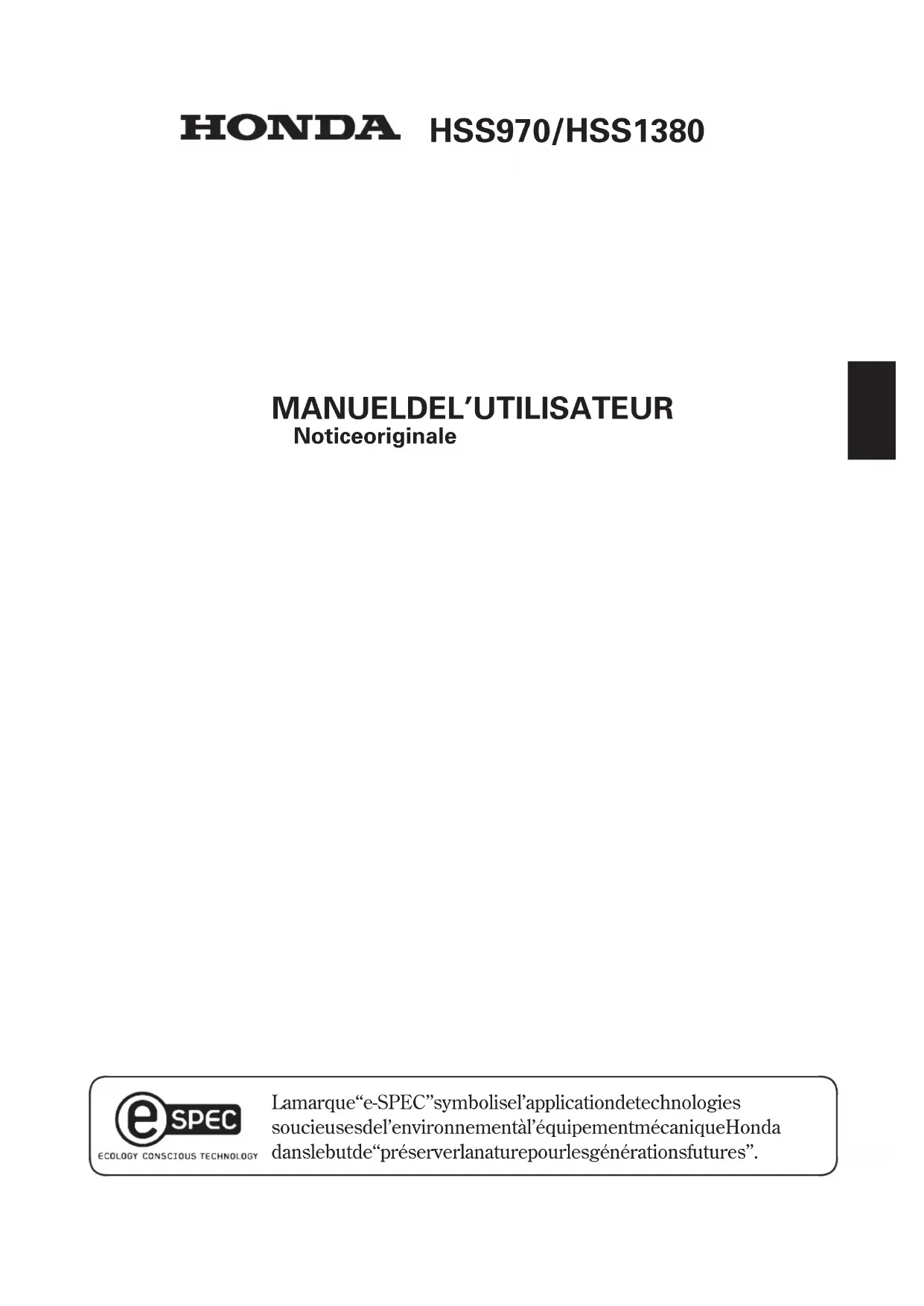 Notice originale HSS970/HSS1380Nous vous remercions d’avoir acheté une déneigeuse Honda. Ce manuel couvre le fonctionnement et l’entretien de la déneigeuse Honda. Honda Motor Co., Ltd. se réserve le droit d’effectuer des modifications à tout moment sans autre avertissement et sans obligation de sa part. Toutes les informations qui figurent dans cette brochure sont basées sur les dernières données du produit disponibles au moment de l’autorisation de mise sous presse. Aucun passage de cette brochure ne pourra être reproduit sans autorisation écrite. Ce manuel doit être considéré comme faisant partie intégrante de la déneigeuse et il devra l’accompagner lors de sa revente. Prêter une attention particulière aux indications précédées des mentions suivantes: Communique des renseignements utiles. Si l’on rencontre un problème, ou si l’on a des questions à poser sur la déneigeuse, consulter un concessionnaire Honda agréé. Les illustrations de ce manuel sont essentiellement basées sur: Les illustrations peuvent varier selon le modèle. HSS970/HSS1380. Type EWS. Sig nale un risque important de blessure, v oire de mort, s’il n’est pas tenu compte des i nstructions. Signaleunrisquedeblessureoudedétériorationdumatériels’il n’est pas tenu compte des instructions. La manipulation de cet appareil exige un effort particulier pour garantir la sécurité de l’opérateur et des autres personnes. Lire ce manuel de façon à bien tout comprendre avant de mettre la déneigeuse en service; faute de quoi, on risquerait des blessures ou une détérioration du matériel.Pour la protection de l’environnement, ne pas jeter ce produit, la batterie, l’huile moteur, etc., aux ordures. Observer la réglementation locale ou consulter son concessionnaire Honda agrée pour s’en débarrasser. Mise au rebut 1......................................................................................................1. REGLES DE SECURITE . 3
