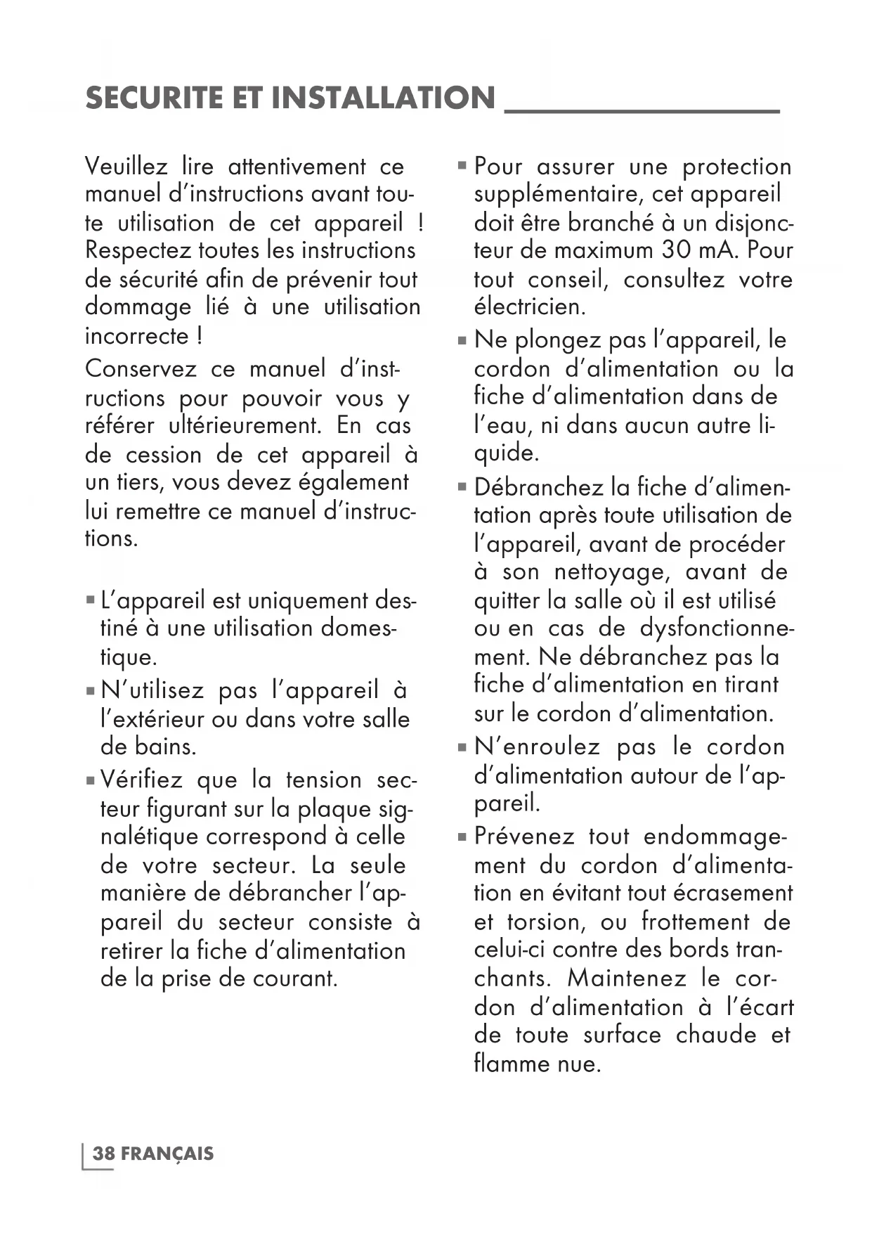 Pour assurer une protection supplémentaire, cet appareil doit être branché à un disjonc- teur de maximum 30 mA. Pour tout conseil, consultez votre électricien.