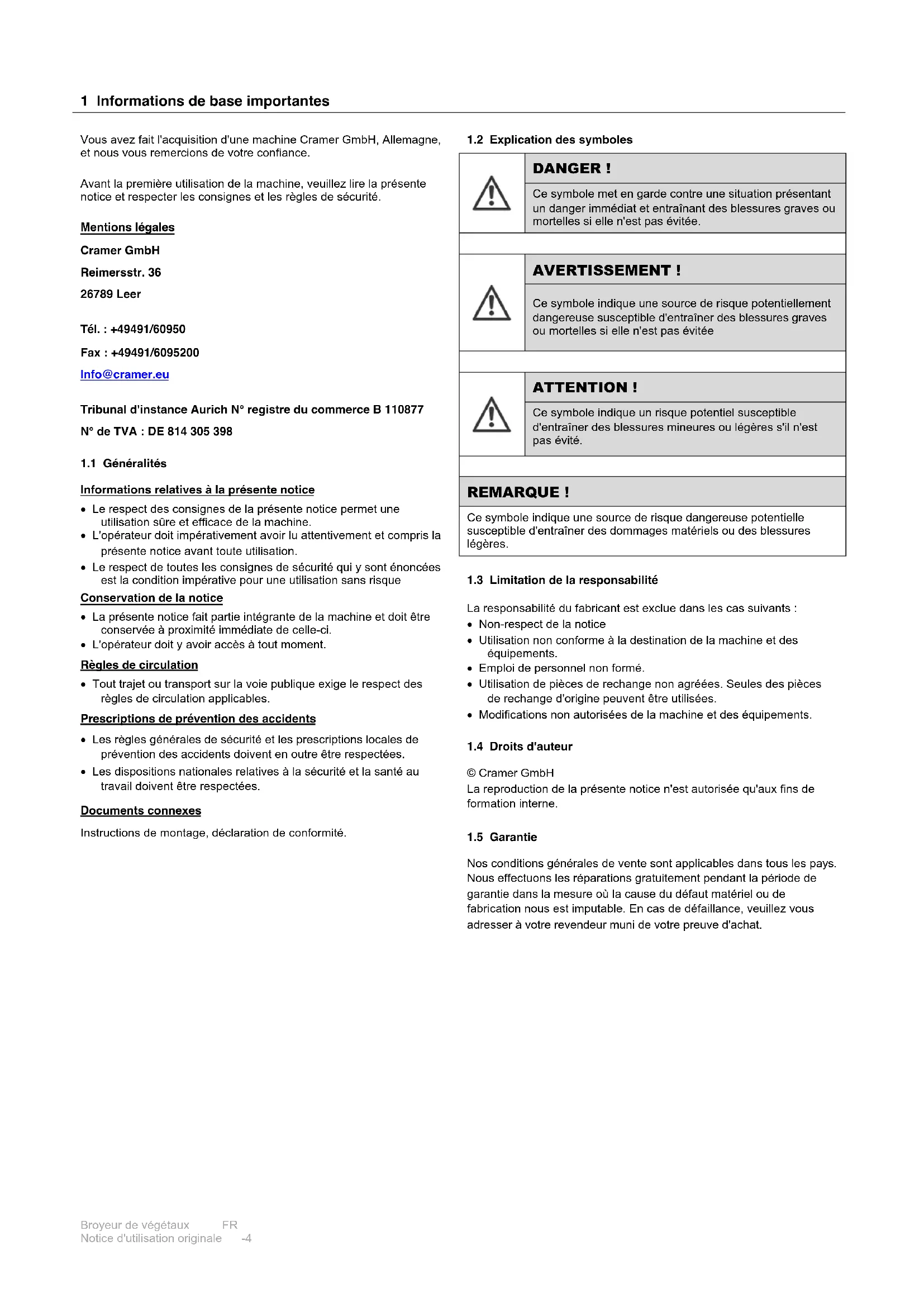 Vous avez fait l'acquisition d'une machine Cramer GmbH, Allemagne, et nous vous remercions de votre confiance. Avant la première utilisation de la machine, veuillez lire la présente notice et respecter les consignes et les règles de sécurité. Mentions légales Cramer GmbH Reimersstr. 36 26789 Leer Tél. : +49491/60950 Fax : +49491/6095200 Info@cramer.eu Tribunal d'instance Aurich N° registre du commerce B 110877 N° de TVA : DE 814 305 398