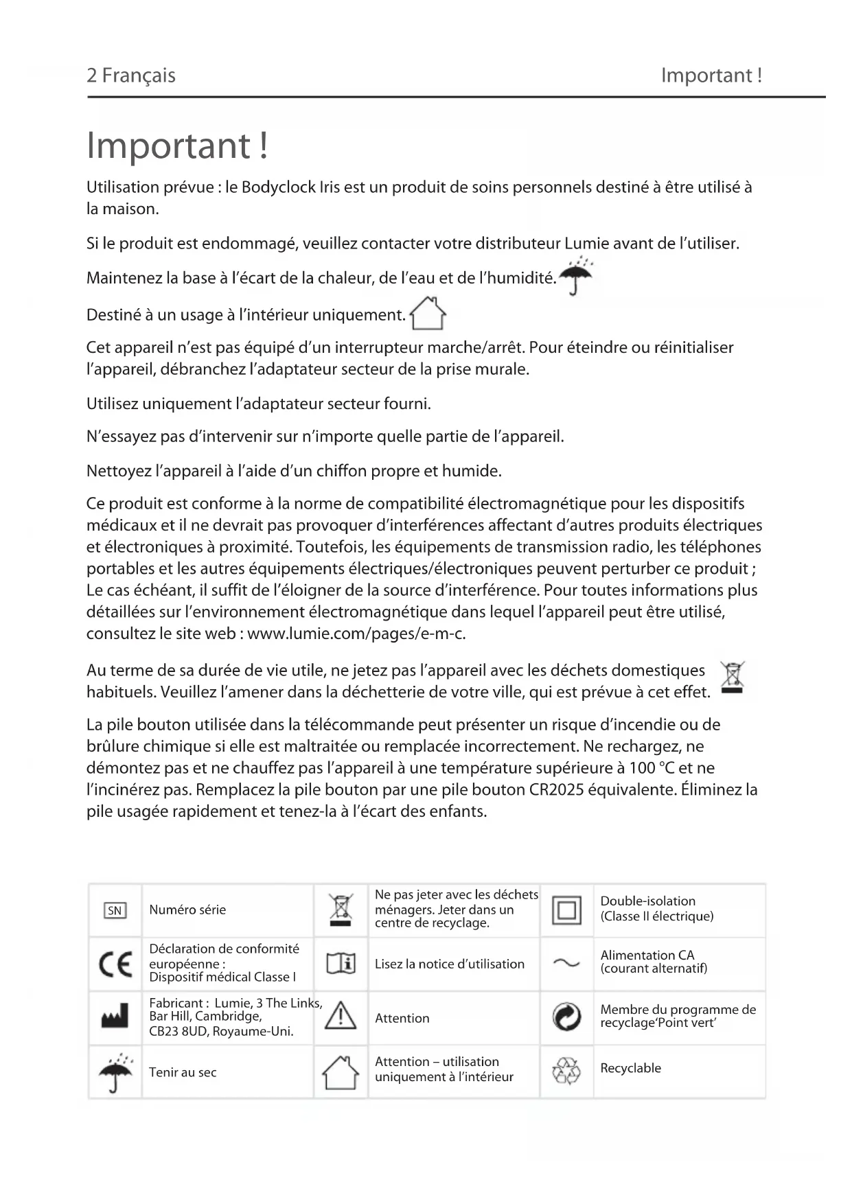 IrisBodyclock GUIDE D’UtIlISatIon 5002 Français Important ! Utilisation prévue : le Bodyclock Iris est un produit de soins personnels destiné à être utilisé à la maison. Si le produit est endommagé, veuillez contacter votre distributeur Lumie avant de l’utiliser. Maintenez la base à l’écart de la chaleur, de l’eau et de l’humidité. Destiné à un usage à l’intérieur uniquement. Cet appareil n’est pas équipé d’un interrupteur marche/arrêt. Pour éteindre ou réinitialiser l’appareil, débranchez l’adaptateur secteur de la prise murale. Utilisez uniquement l’adaptateur secteur fourni. N’essayez pas d’intervenir sur n’importe quelle partie de l’appareil. Nettoyez l’appareil à l’aide d’un chiffon propre et humide. Ce produit est conforme à la norme de compatibilité électromagnétique pour les dispositifs médicaux et il ne devrait pas provoquer d’interférences affectant d’autres produits électriques et électroniques à proximité. Toutefois, les équipements de transmission radio, les téléphones portables et les autres équipements électriques/électroniques peuvent perturber ce produit ; Le cas échéant, il suffit de l’éloigner de la source d’interférence. Pour toutes informations plus détaillées sur l’environnement électromagnétique dans lequel l’appareil peut être utilisé, consultez le site web : www.lumie.com/pages/e-m-c. Au terme de sa durée de vie utile, ne jetez pas l’appareil avec les déchets domestiques habituels. Veuillez l’amener dans la déchetterie de votre ville, qui est prévue à cet effet. La pile bouton utilisée dans la télécommande peut présenter un risque d’incendie ou de brûlure chimique si elle est maltraitée ou remplacée incorrectement. Ne rechargez, ne démontez pas et ne chauffez pas l’appareil à une température supérieure à 100 °C et ne l’incinérez pas. Remplacez la pile bouton par une pile bouton CR2025 équivalente. Éliminez la pile usagée rapidement et tenez-la à l’écart des enfants.