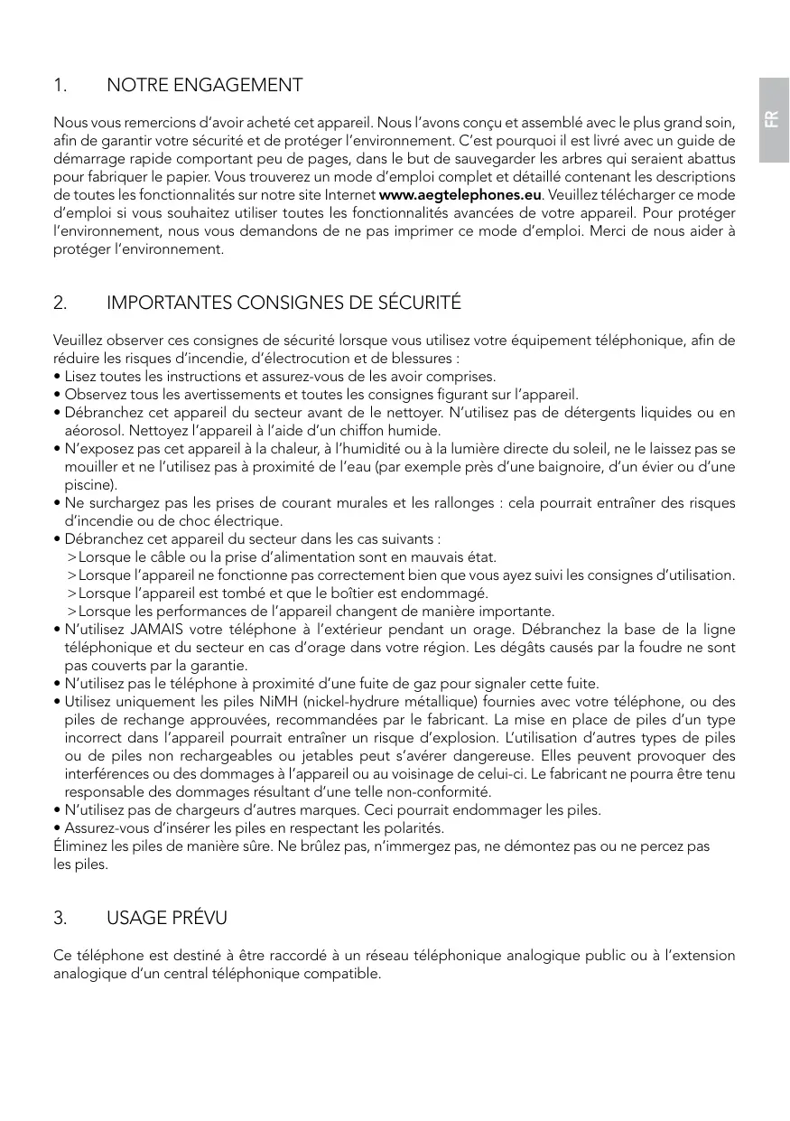 NOTRE ENGAGEMENT Nous vous remercions d‘avoir acheté cet appareil. Nous l’avons conçu et assemblé avec le plus grand soin, afin de garantir votre sécurité et de protéger l’environnement. C’est pourquoi il est livré avec un guide de démarrage rapide comportant peu de pages, dans le but de sauvegarder les arbres qui seraient abattus pour fabriquer le papier. Vous trouverez un mode d’emploi complet et détaillé contenant les descriptions de toutes les fonctionnalités sur notre site Internet www.aegtelephones.eu. Veuillez télécharger ce mode d’emploi si vous souhaitez utiliser toutes les fonctionnalités avancées de votre appareil. Pour protéger l’environnement, nous vous demandons de ne pas imprimer ce mode d’emploi. Merci de nous aider à protéger l‘environnement.