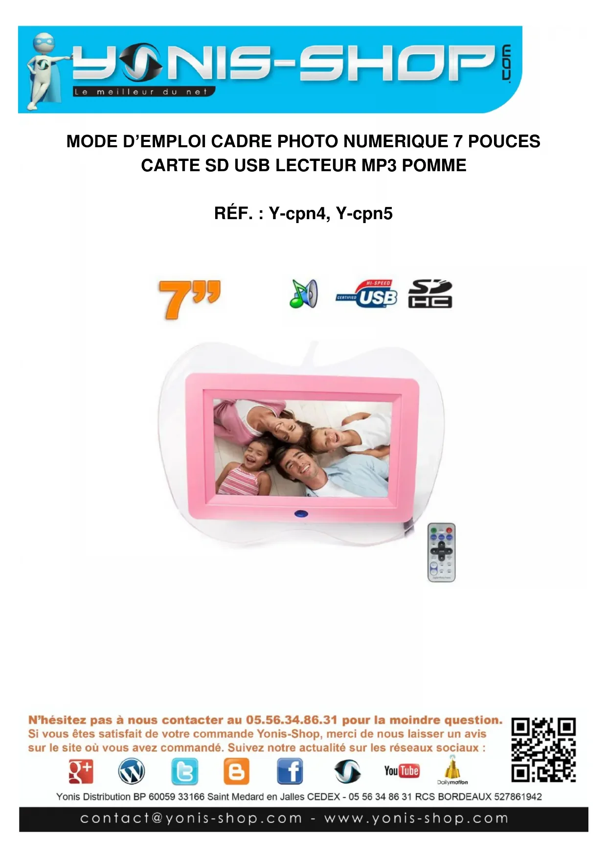 Nous vous remercions d’avoir commandé sur Yonis-shop.com. Pour toutes questions relatives à cet article, nous vous invitons à nous contacter : - Via le formulaire de contact sur www.yonis-shop.com - Via le site de votre achat (Ebay, Amazon, Cdiscount...Etc.) - Par mail à contact@yonis-shop.com - Par téléphone au 05 56 34 86 31 de 10h00 à 19h00