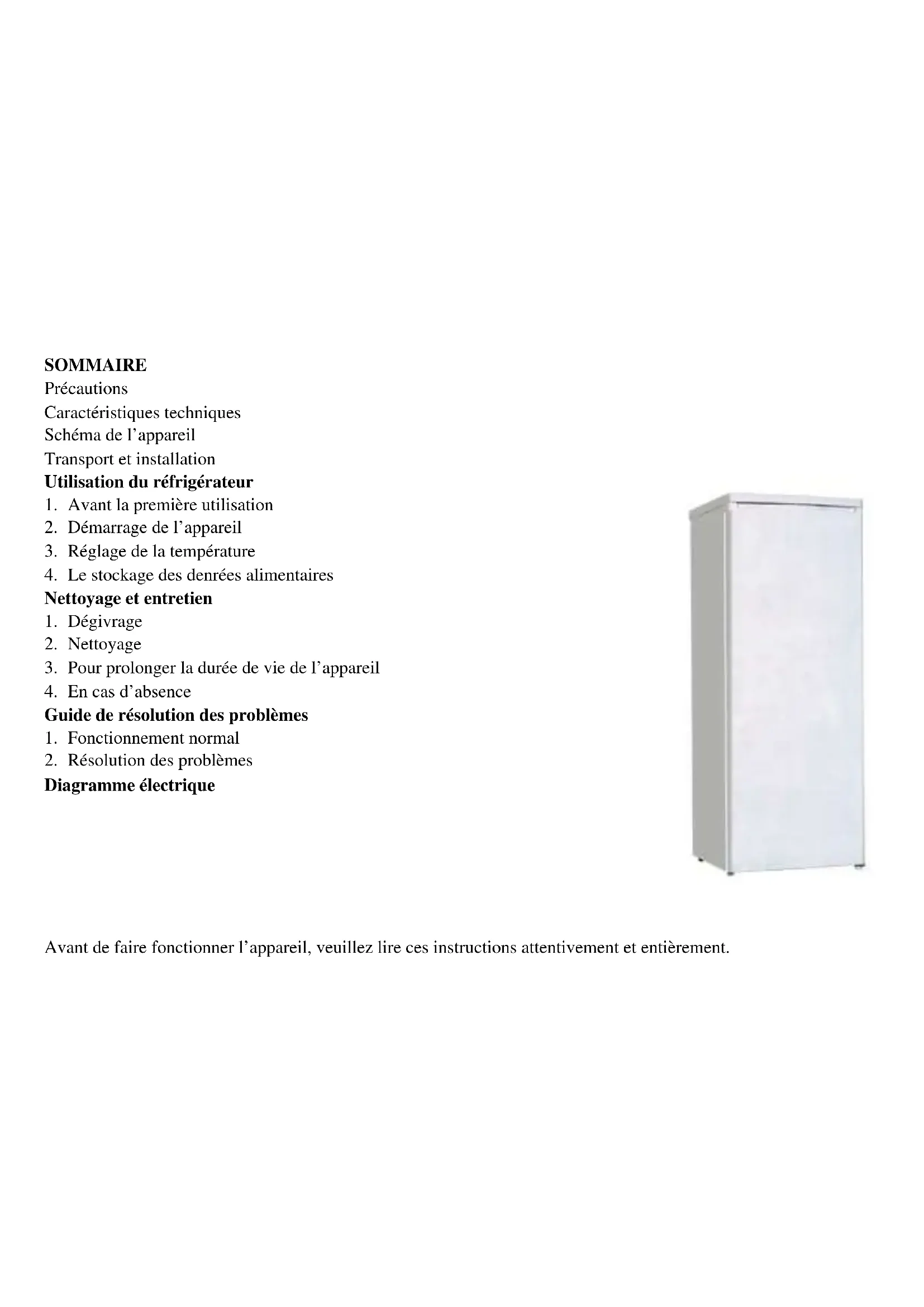 Avec éclairage Remarque : L’amélioration continue de notre gamme peut engendrer de légères modifications dans le circuit électrique, nous nous réservons le droit d’effectuer ces changements sans avis préalable.Attention Cet appareil n’est pas conçu pour être utilisé par des personnes (y compris des enfants) ayant des capacités physiques, mentales ou sensorielles réduites ou manquant d’expérience et de connaissance, à moins qu’une personne responsable de leur sécurité ne les surveillent ou leur donne les instructions concernant l’utilisation de l’appareil. N’utilisez pas de dispositifs mécaniques ou tout autre moyen afin d’accélérer le processus de dégivrage, à moins qu’ils ne soient recommandés par le fabricant. N’endommagez pas le circuit réfrigérant. N’utilisez pas d’appareil électrique à l’intérieur des compartiments de stockage des aliments, à moins qu’ils ne soient recommandés par le fabricant.