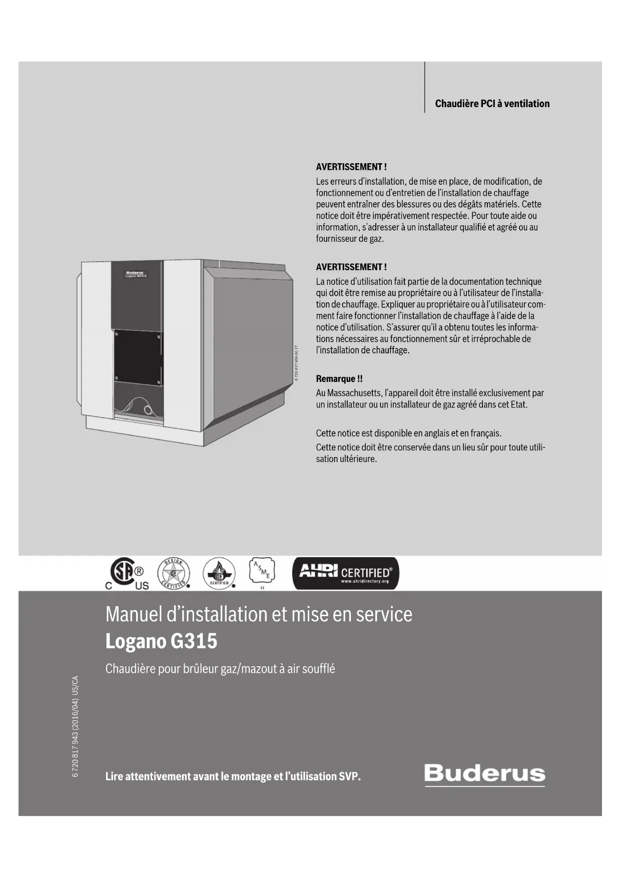 Lire attentivement avant le montage et l’utilisation SVP. Manuel d’installation et mise en service Chaudière PCI à ventilation Logano G315 AVERTISSEMENT ! Les erreurs d’installation, de mise en place, de modification, de fonctionnement ou d’entretien de l’installation de chauffage peuvent entraîner des blessures ou des dégâts matériels. Cette notice doit être impérativement respectée. Pour toute aide ou information, s’adresser à un installateur qualifié et agréé ou au fournisseur de gaz. AVERTISSEMENT ! La notice d’utilisation fait partie de la documentation technique qui doit être remise au propriétaire ou à l’utilisateur de l’installa- tion de chauffage. Expliquer au propriétaire ou à l’utilisateur com- ment faire fonctionner l’installation de chauffage à l’aide de la notice d’utilisation. S’assurer qu’il a obtenu toutes les informa- tions nécessaires au fonctionnement sûr et irréprochable de l’installation de chauffage. Remarque !! Au Massachusetts, l’appareil doit être installé exclusivement par un installateur ou un installateur de gaz agréé dans cet Etat. Cette notice est disponible en anglais et en français. Cette notice doit être conservée dans un lieu sûr pour toute utili- sation ultérieure. 6 720 817 939-00.1T Chaudière pour brûleur gaz/mazout à air soufflé 6 720 817 943 (2016/04) US/CATable des matières Logano G315 – 6 720 817 943 (2016/04)2 Remarque Cette notice de montage et d’entretien contient des informations impor- tantes pour le montage, la mise en service et l’entretien fiables et profes- sionnels de la chaudière spéciale Logano G315. La notice de montage et d’entretien est destinée à l’installateur dont les connaissances et l’expérience sont suffisantes pour lui permettre de tra- vailler sur les installations de chauffage ainsi que les installations au mazout et au gaz. La chaudière spéciale Logano G315 est livrée en deux variantes (en élé- ments séparés et en blocs assemblés). La présente notice de montage et d’entretien décrit plus particulière- ment le montage et l’entretien basés sur les livraisons en éléments sépa- rés et en blocs assemblés. Table des matières 1 Explication des symboles et mesures de sécurité ... 3