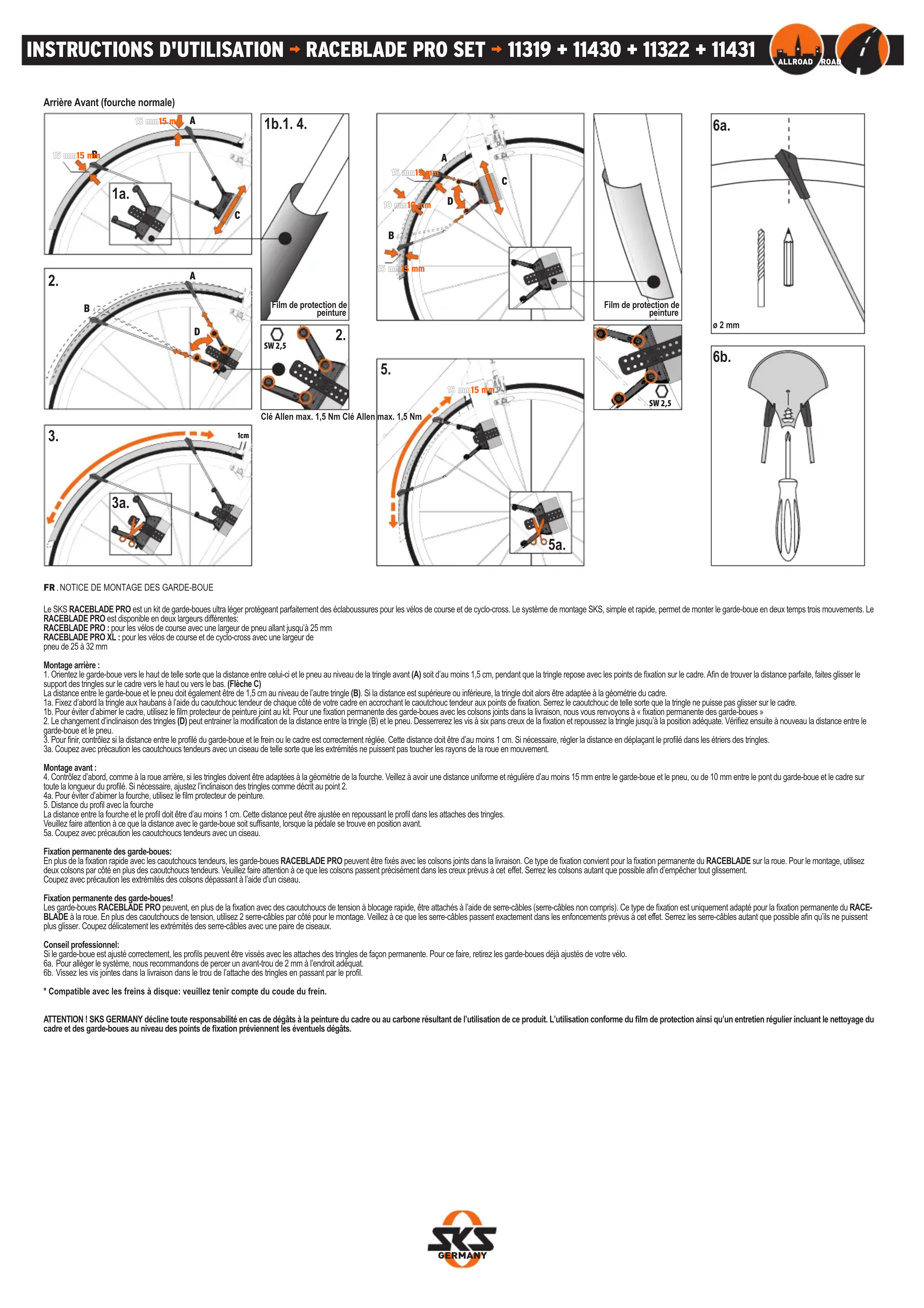 ATTENTION ! SKS GERMANY décline toute responsabilité en cas de dégâts à la peinture du cadre ou au carbone résultant de l'utilisation de ce produit. L'utilisation conforme du film de protection ainsi qu'un entretien régulier incluant le nettoyage du cadre et des garde-boues au niveau des points de fixation préviennent les éventuels dégâts.