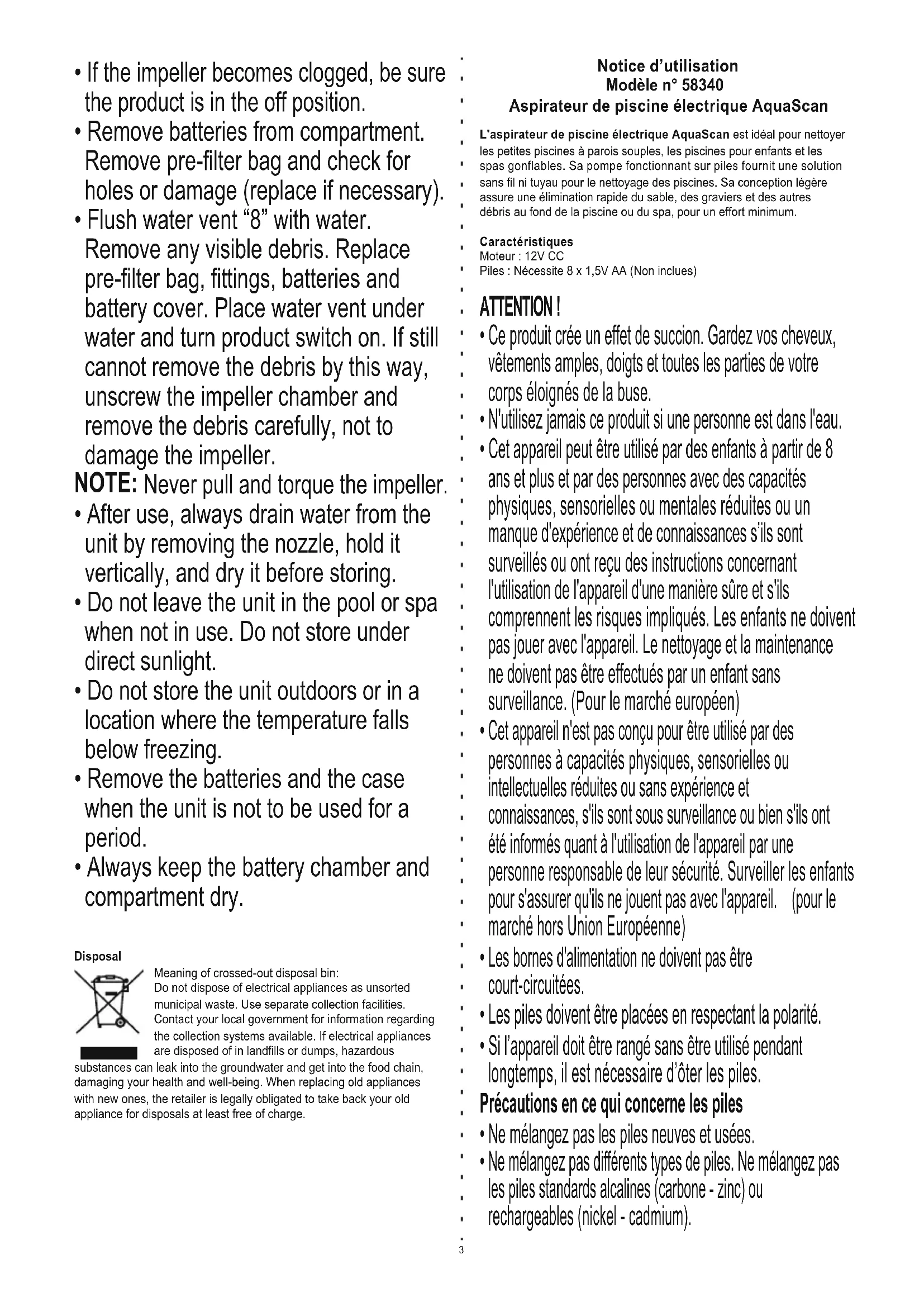 - Always keep the battery chamber and compartment dry. Fig.3 Fig.2 Fig.1Notice d’utilisation Modèle n° 58340 Aspirateur de piscine électrique AquaScan L'aspirateur de piscine électrique AquaScan est idéal pour nettoyer les petites piscines à parois souples, les piscines pour enfants et les spas gonflables. Sa pompe fonctionnant sur piles fournit une solution sans fil ni tuyau pour le nettoyage des piscines. Sa conception légère assure une élimination rapide du sable, des graviers et des autres débris au fond de la piscine ou du spa, pour un effort minimum. Caractéristiques Moteur : 12V CC Piles : Nécessite 8 x 1,5V AA (Non inclues) ATTENTION !