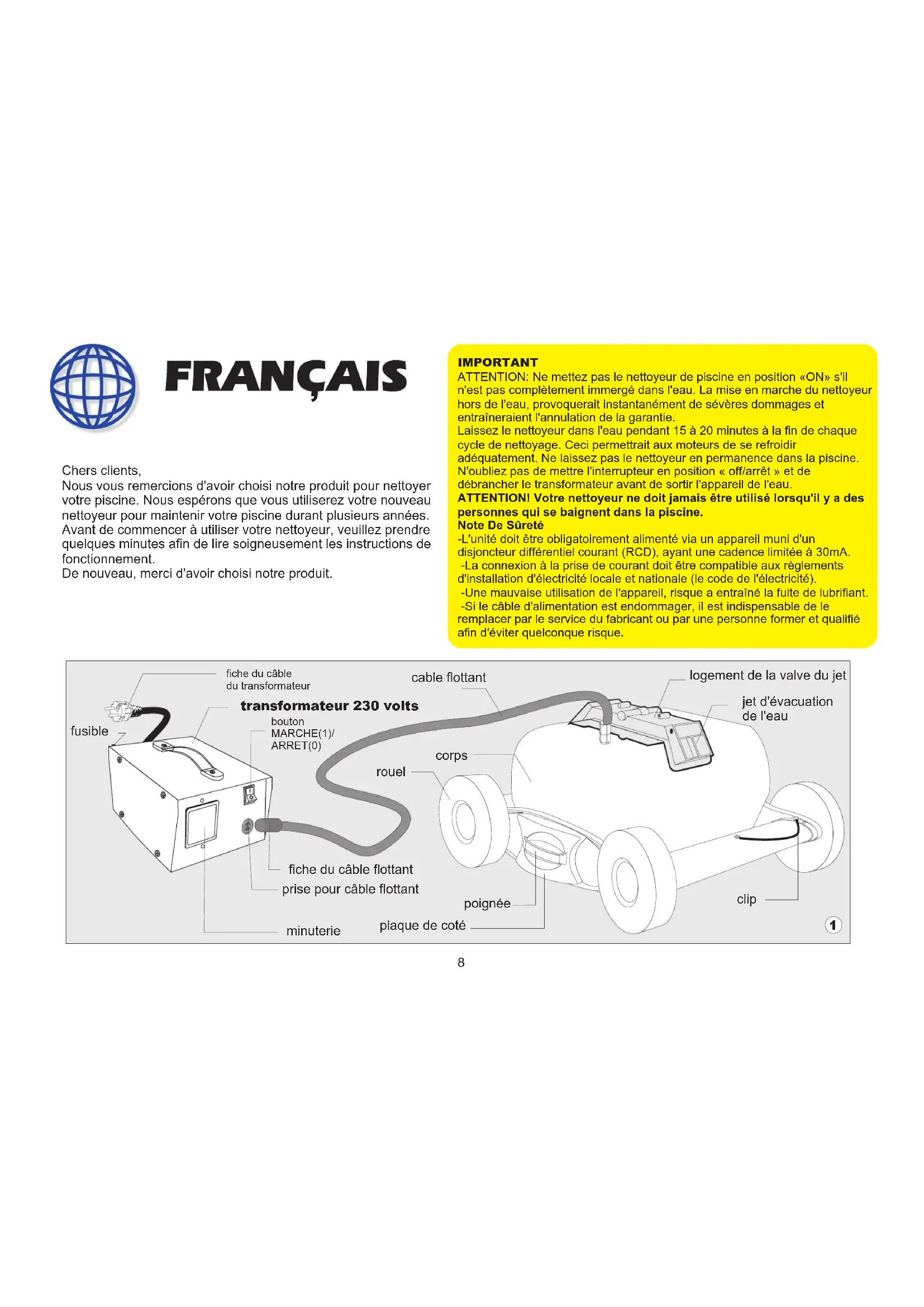 Nous vous remercions d'avoir choisi notre produit pour nettoyer votre piscine. Nous espérons que vous utiliserez cette nouvelle nettoyeur pour maintainir cette piscine durant plusieurs années. Avant deCOMMencer à utiliser libre nettoyeur, veuillez prendre quelques minutes afin de dire soigneusement les instructions de fonctionnement.